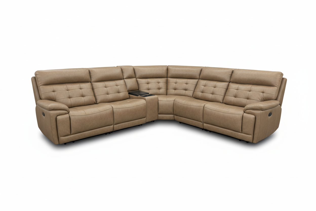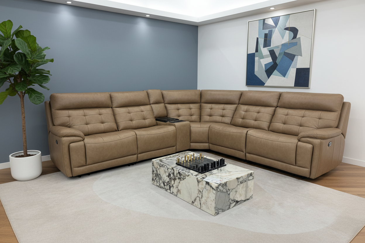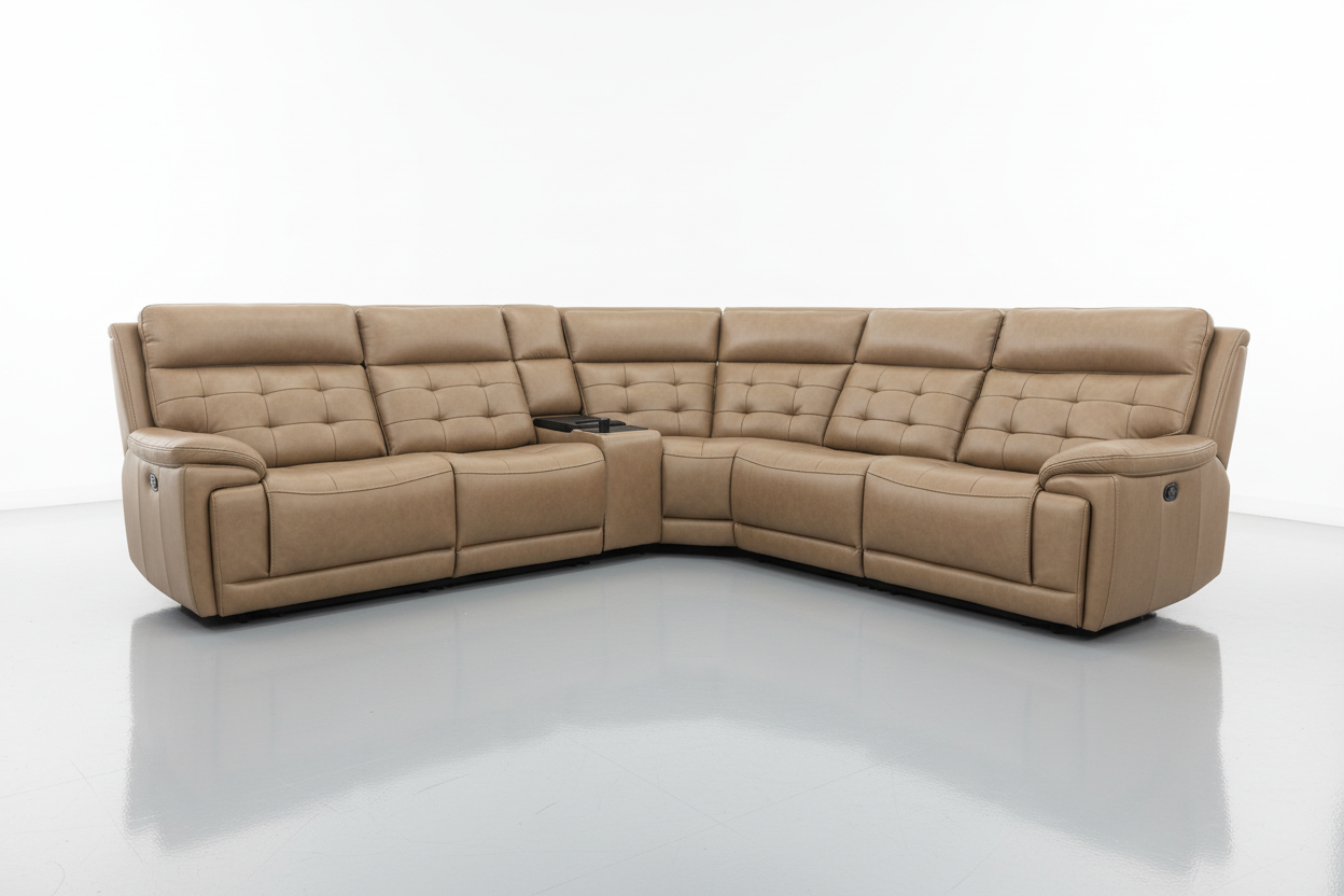 The Barcelona Modern Motion Reclining Sectional embodies the perfect marriage of classic elegance and contemporary comfort. Upholstered in premium tan leather with sophisticated button-tufted detailing, this exceptional sectional brings refined luxury and cutting-edge power reclining technology to your living space.
