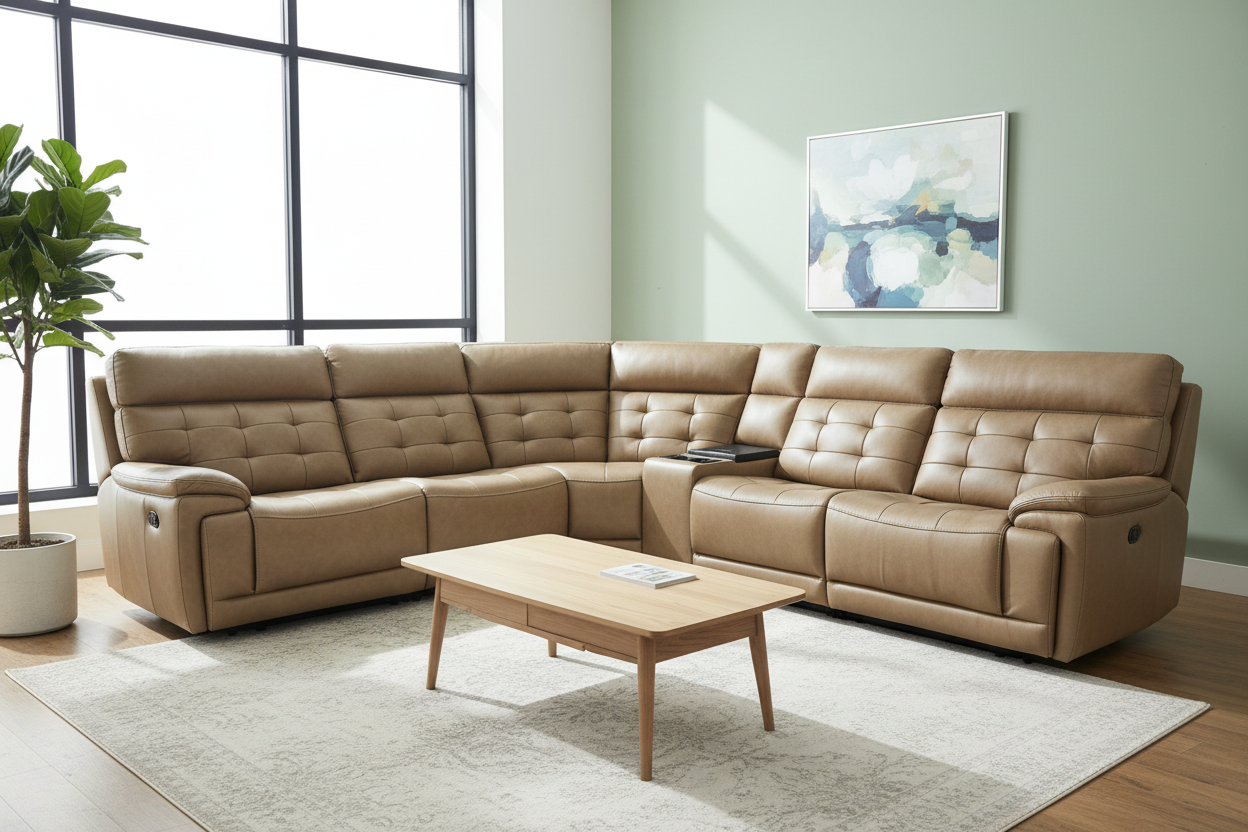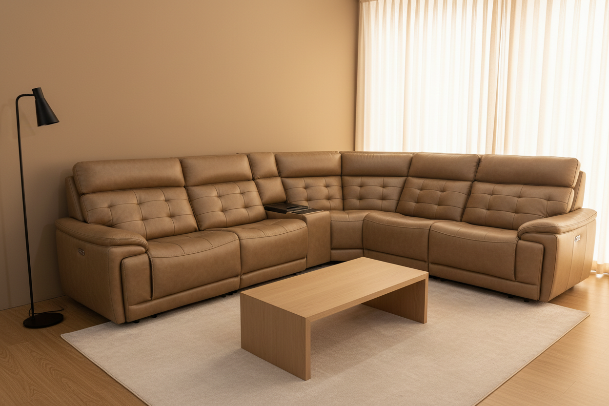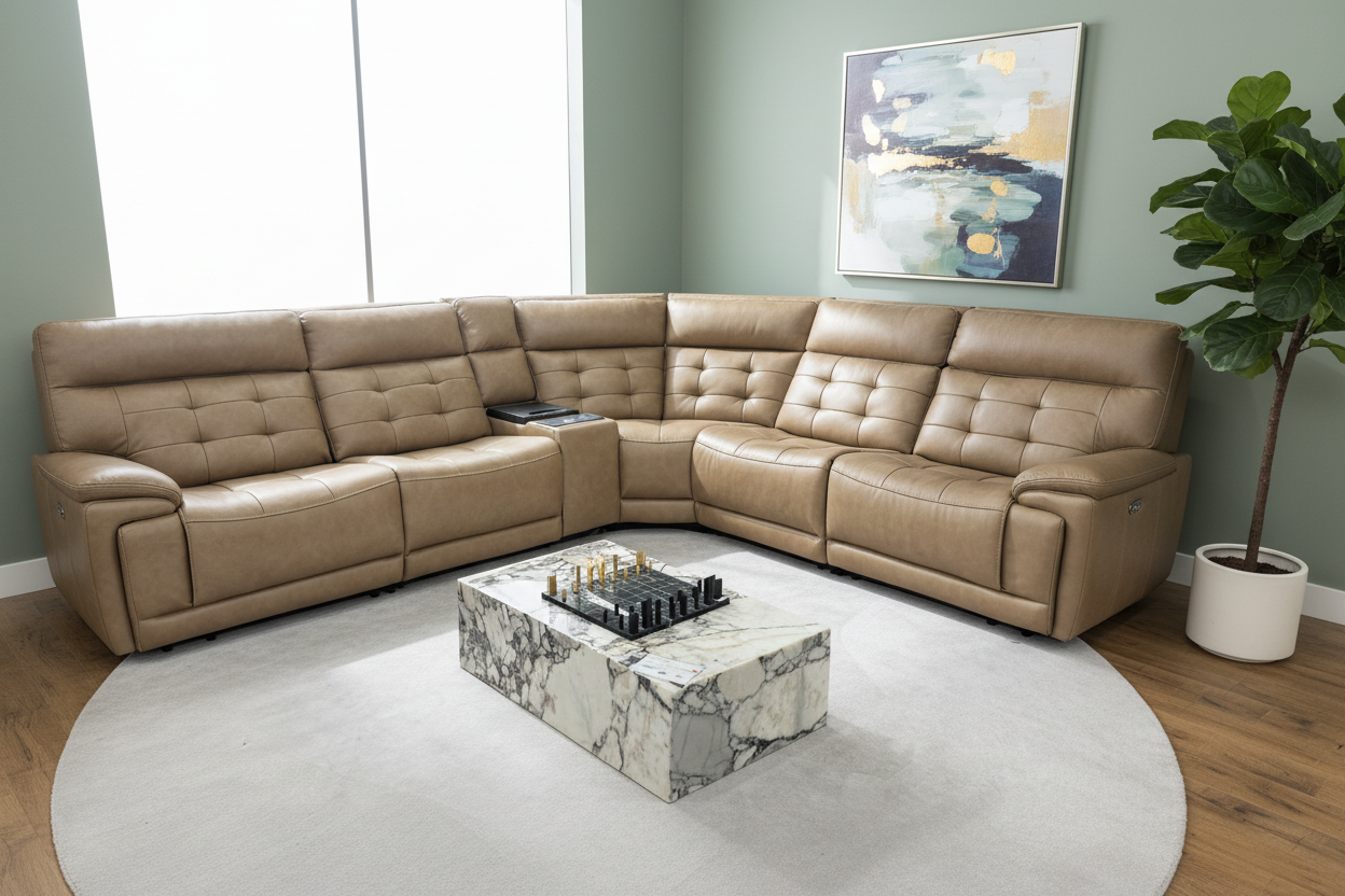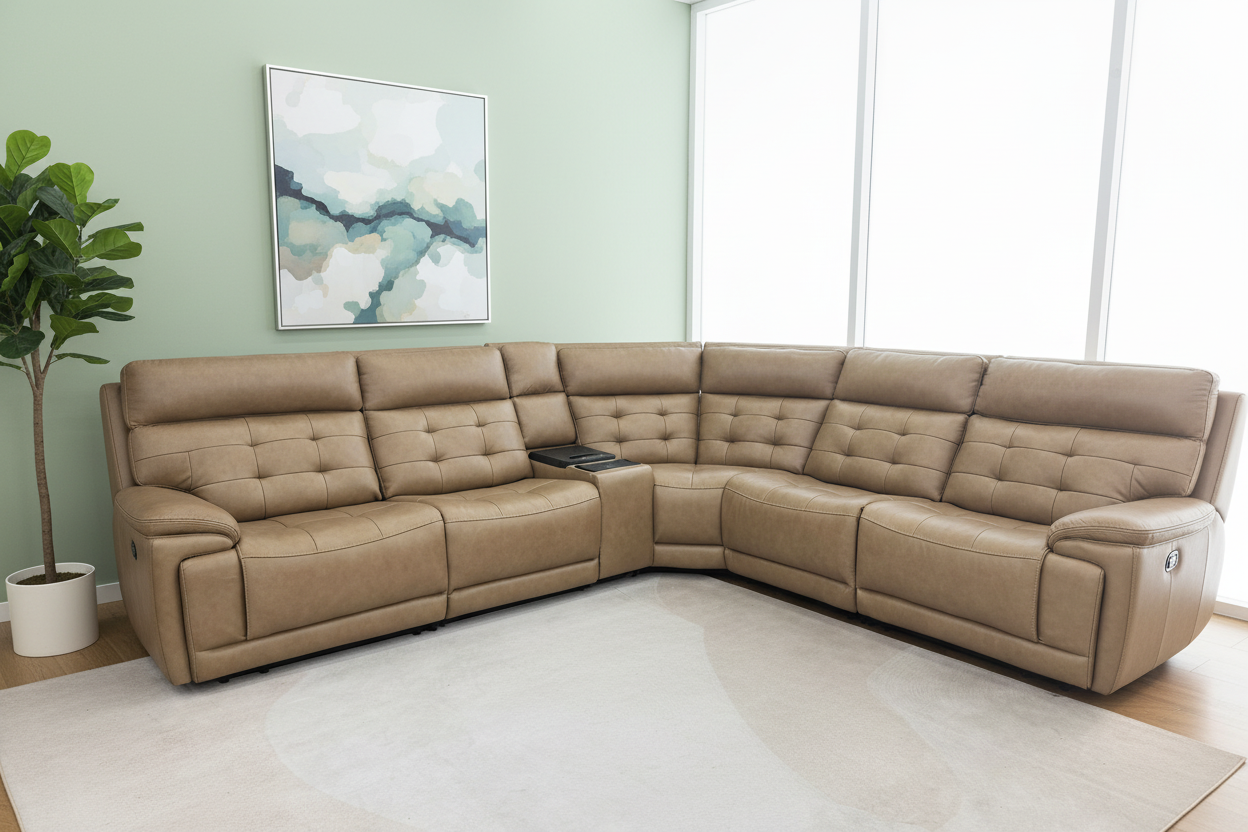 The Barcelona Modern Motion Reclining Sectional embodies the perfect marriage of classic elegance and contemporary comfort. Upholstered in premium tan leather with sophisticated button-tufted detailing, this exceptional sectional brings refined luxury and cutting-edge power reclining technology to your living space.