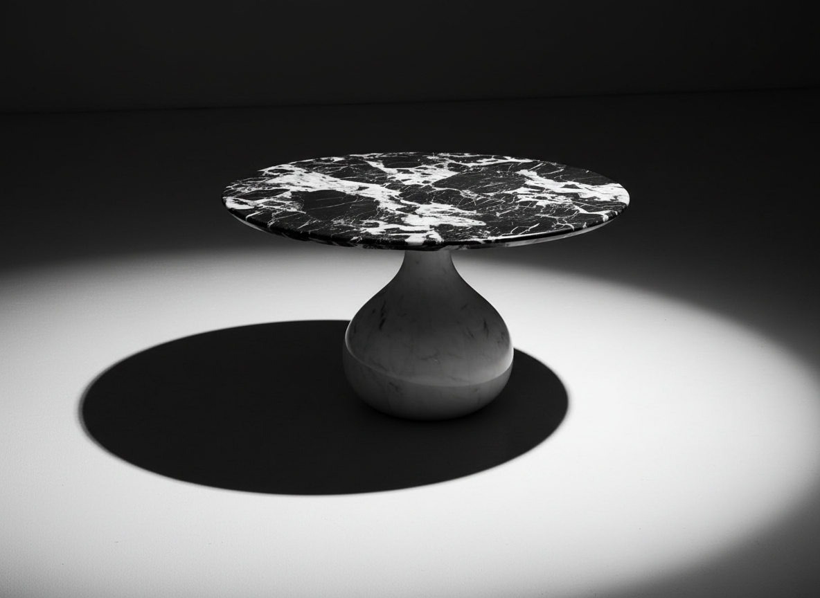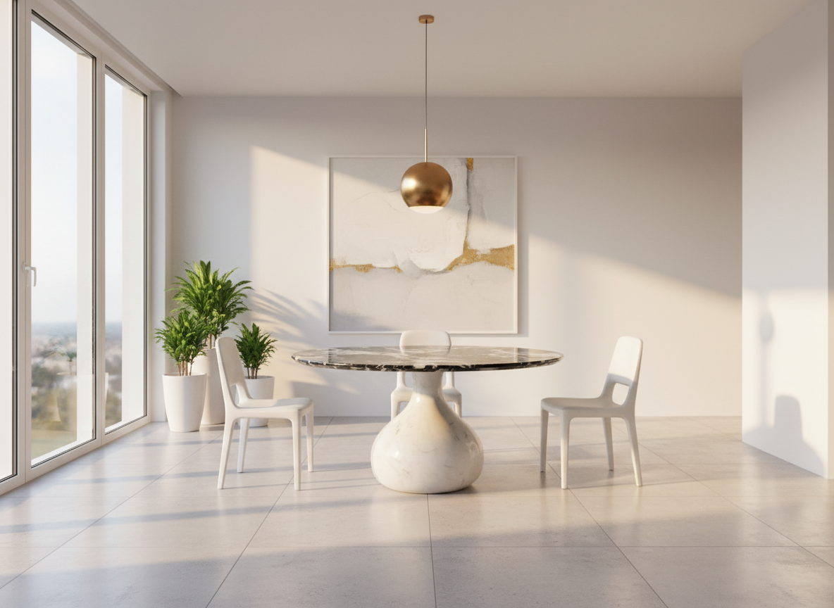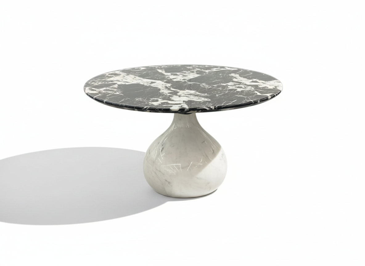 The table’s sculptural base, resembling an elegant teardrop or blossoming flower bud, is crafted from smooth white marble with subtle grey veining. This organic shape adds softness to the bold tabletop, creating a perfect balance of contemporary style and timeless beauty. The Anemone Dining Table serves as both a functional centerpiece and an artistic statement, ideal for those looking to make a bold yet sophisticated impression in their dining area.