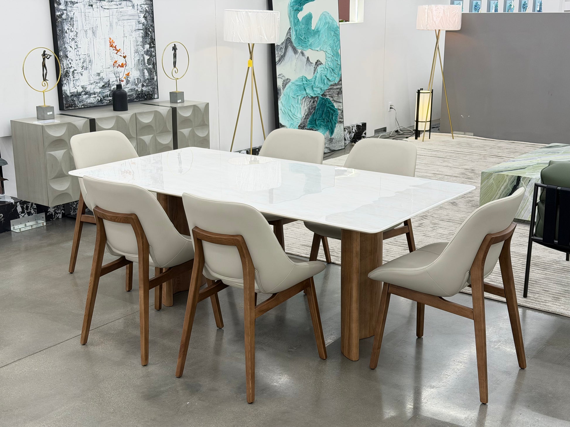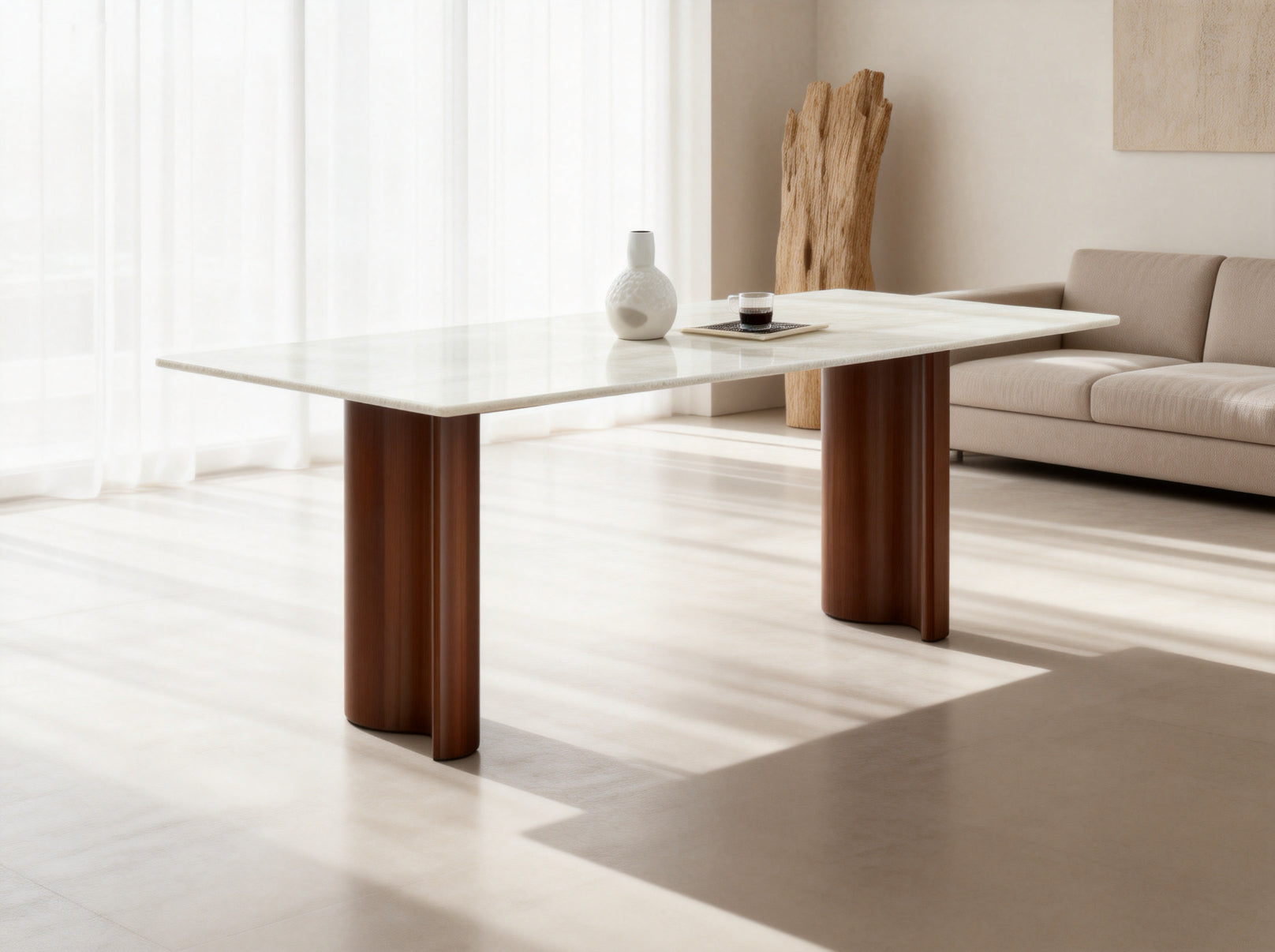 The Arctic Marble Dining Table brings a serene, modern elegance to your home with its crisp marble surface and warm sculptural base. Its streamlined silhouette and clean proportions make it the perfect balance of minimalism and luxury—an effortless centerpiece for contemporary dining spaces. The soft veining of the marble top adds natural movement and refinement, while the curved wood legs introduce warmth and architectural interest.