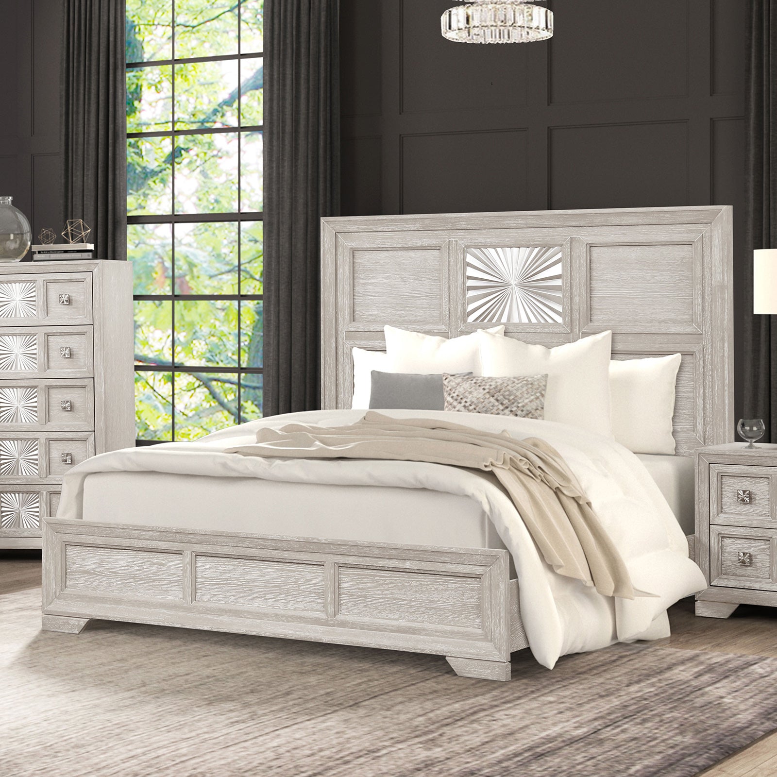 The Argenthart Traditional Bed combines timeless detailing with modern functionality, making it a stunning centerpiece for any bedroom. Available in Queen or Eastern King sizes, it is finished in a refined light gray tone that highlights its transitional appeal.