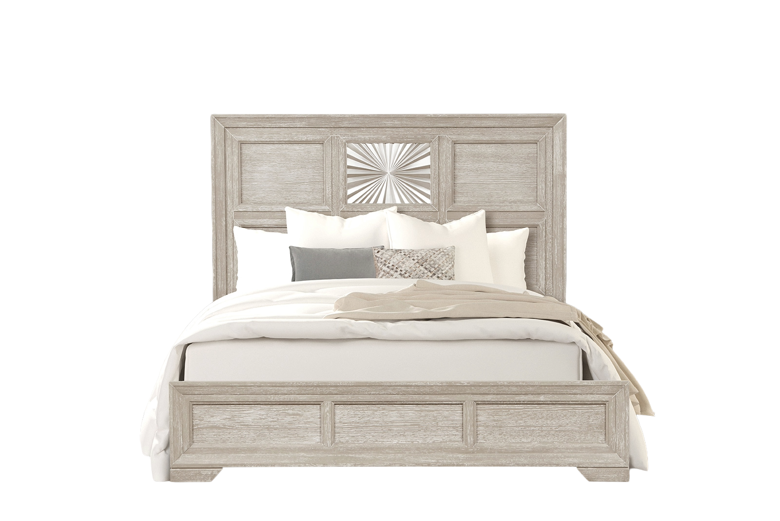 Crafted from poplar, oak veneer, and engineered wood, this bed offers both durability and beauty. The standout feature is its sunburst pattern headboard, adding texture and character while maintaining a clean, classic look. Built with thoughtful craftsmanship, it pairs beautifully with coordinating storage pieces to complete your bedroom suite.
