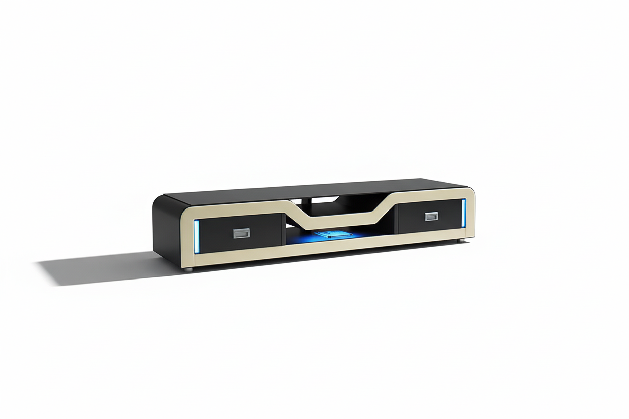 Part of our exclusive Artia collection, this TV stand embodies the perfect fusion of art and technology. The integrated LED lighting doesn't just illuminate—it creates atmosphere. The curved design doesn't just look beautiful—it defines your space. Every storage compartment has been strategically placed for intuitive access to your entertainment essentials.