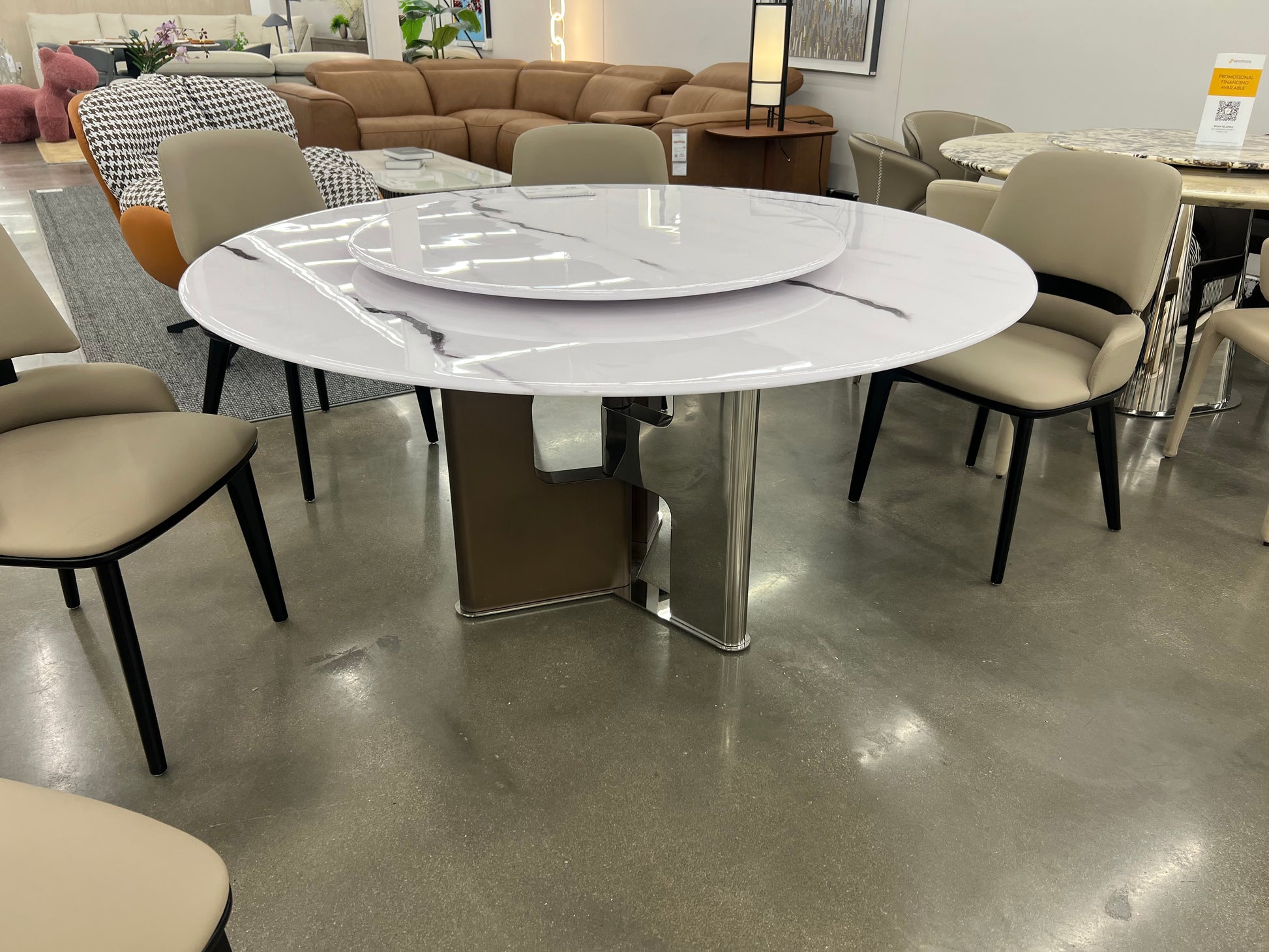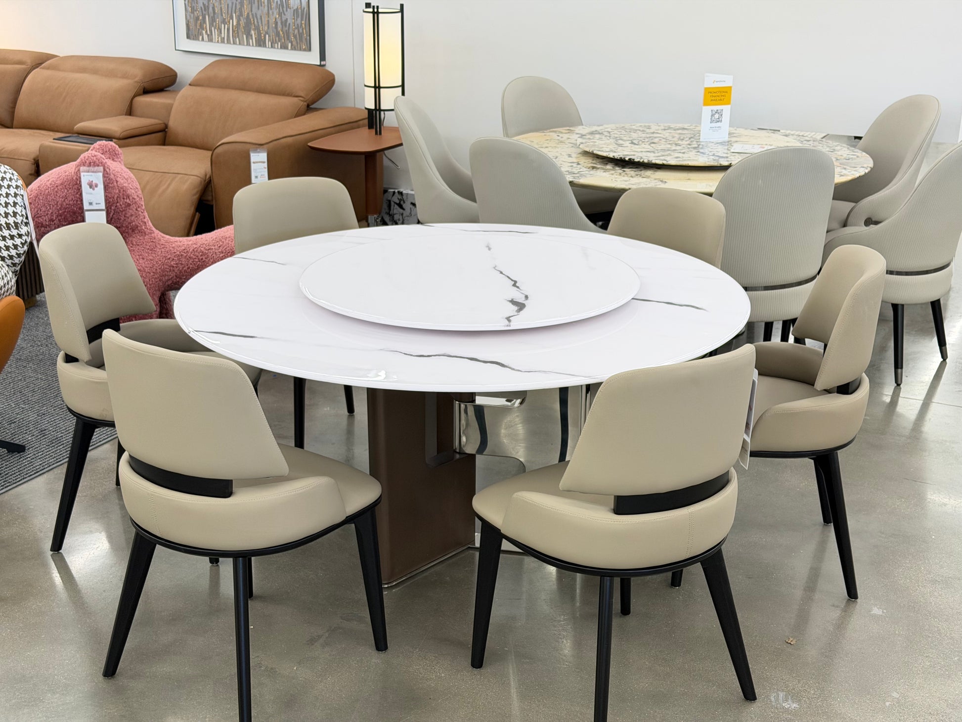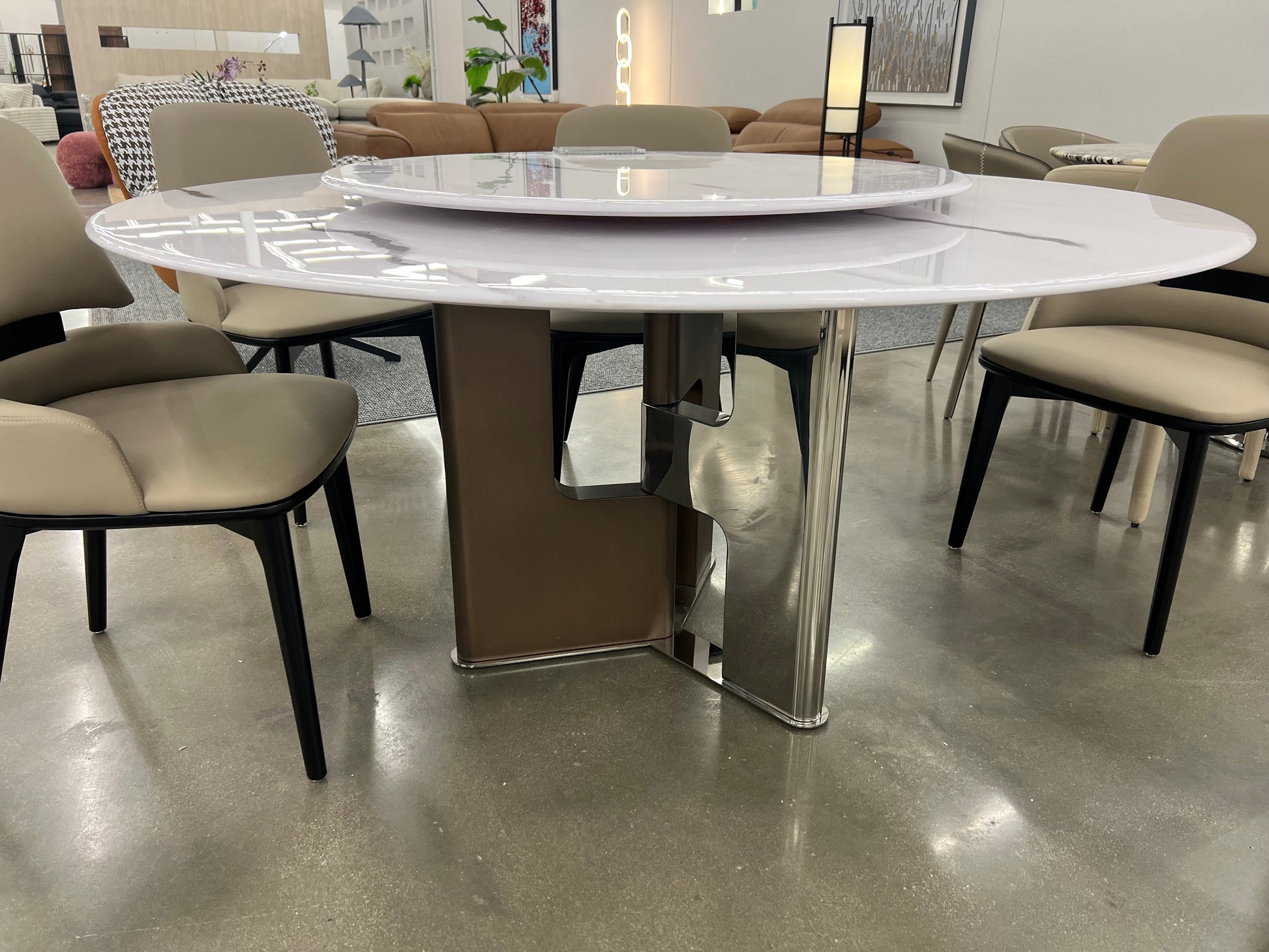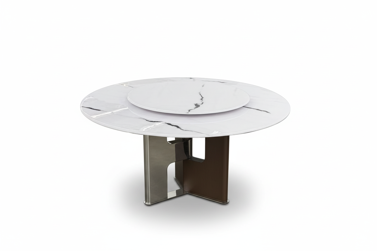 The Aurora Round Dining Table blends modern elegance with timeless luxury, featuring a beautifully polished marble top and a sleek geometric base. Designed for both everyday dining and elevated hosting, it brings a refined statement to any contemporary home. The integrated rotating tray enhances convenience without compromising style.
