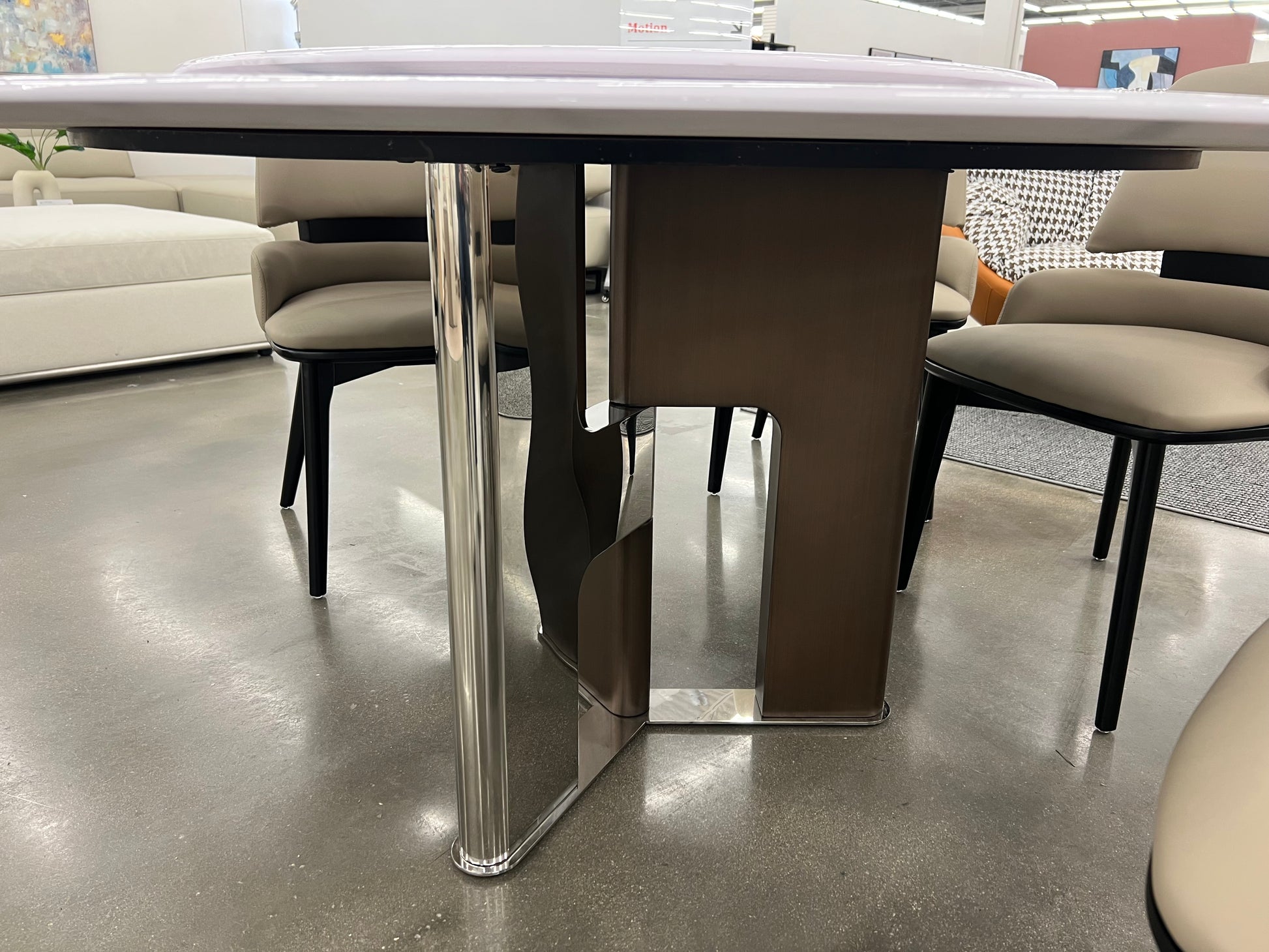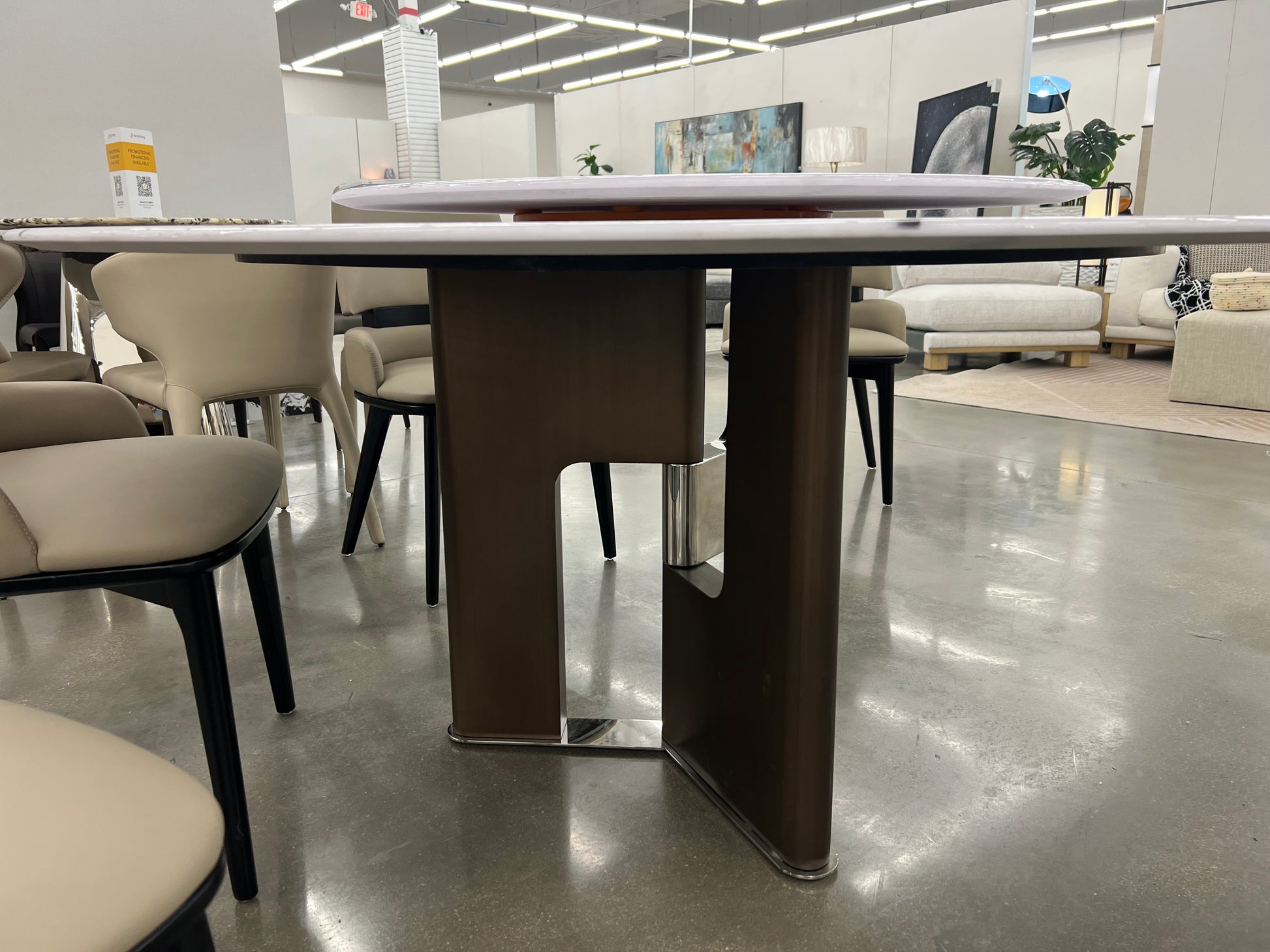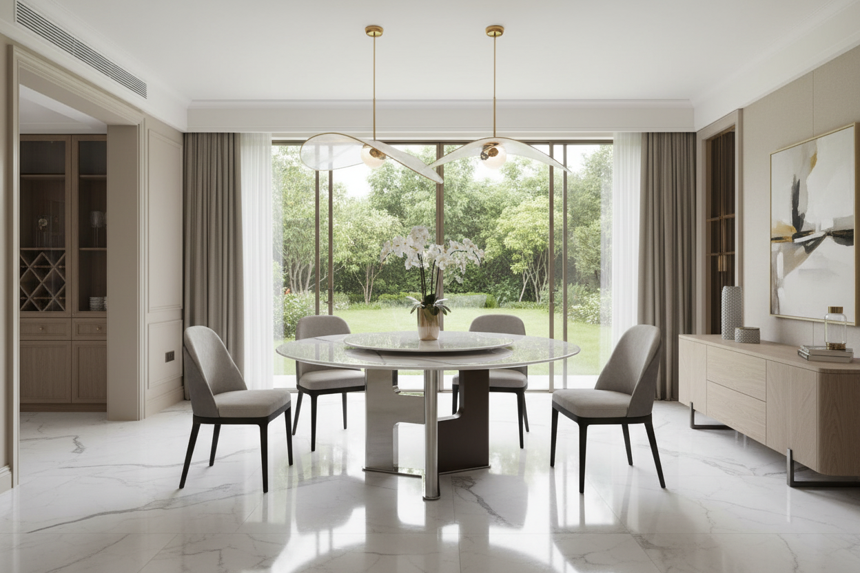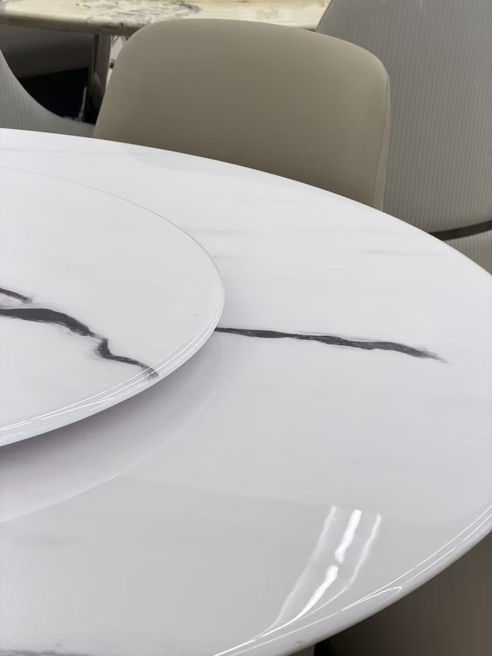 The Aurora Round Dining Table blends modern elegance with timeless luxury, featuring a beautifully polished marble top and a sleek geometric base. Designed for both everyday dining and elevated hosting, it brings a refined statement to any contemporary home. The integrated rotating tray enhances convenience without compromising style.