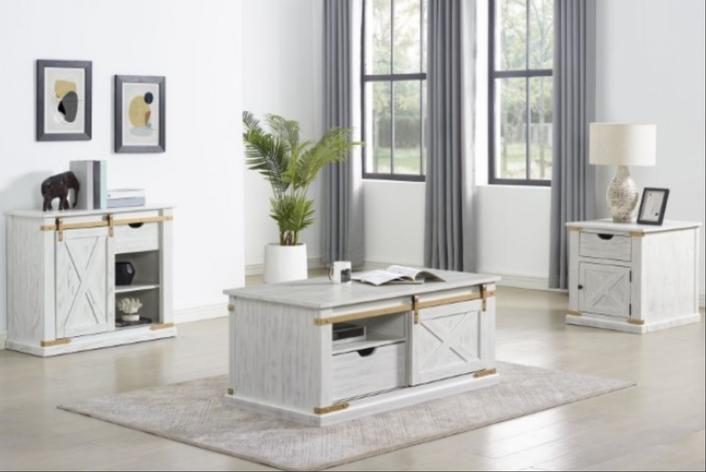 Inspired by farmhouse style, the table features a sliding barn door and cross-panel details that add texture and characteGlamorous Accents