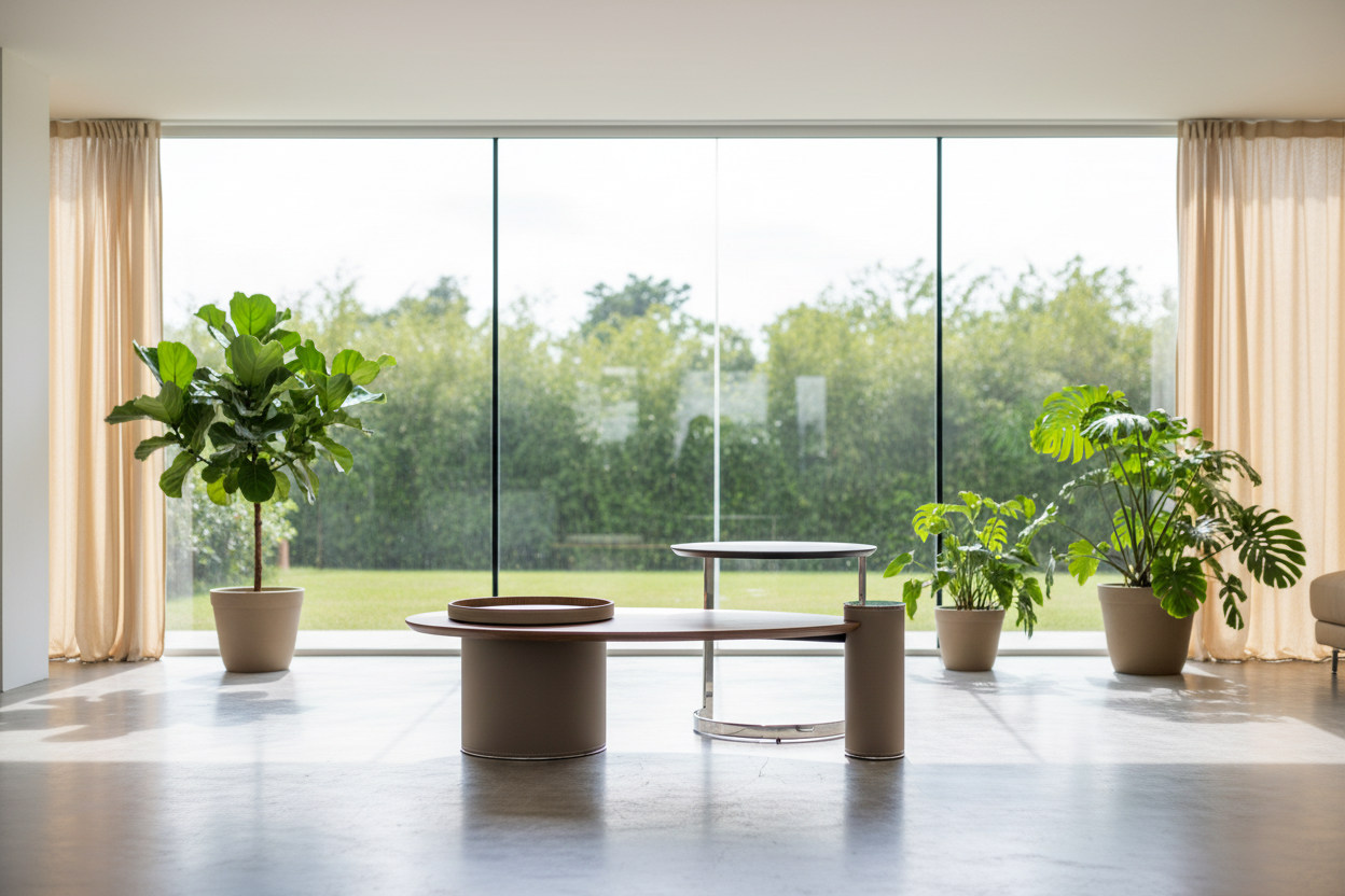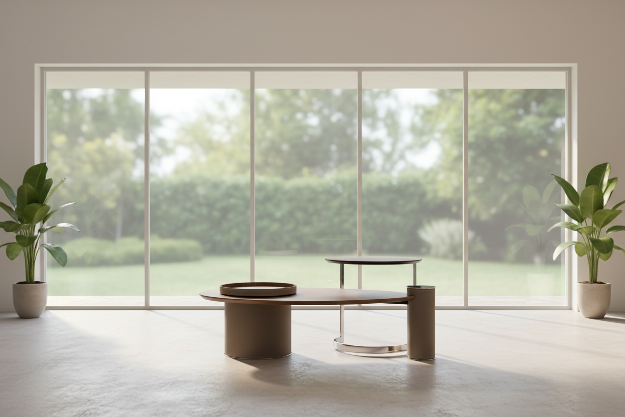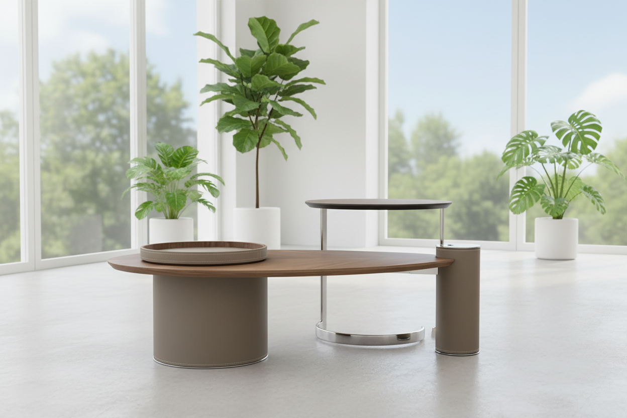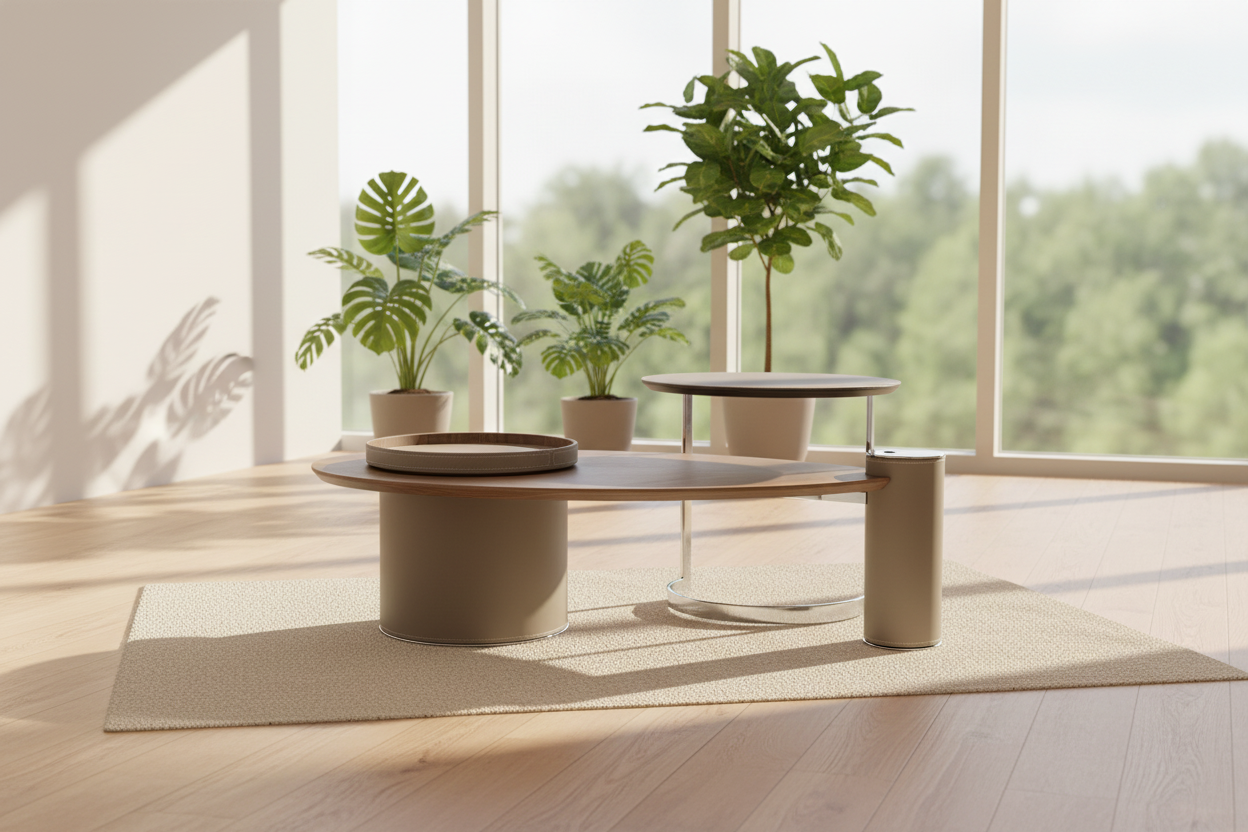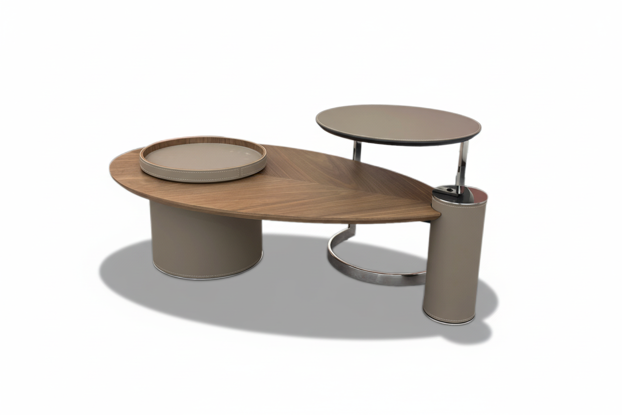 A secondary round table, slightly elevated and supported by a polished metal frame, adds versatility and dynamic layering to the set. An included matching taupe tray with fine stitching details adds functionality and style, perfect for serving or organizing small items. The Big Leaf Coffee Table Set seamlessly blends nature-inspired design with contemporary sophistication, making it a standout centerpiece for modern and eclectic interiors alike.