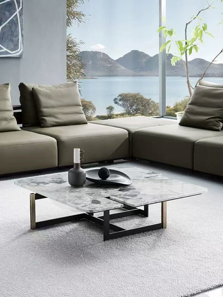 The bold base, crafted from sturdy metal with gold and black accents, adds a refined architectural touch, making this table as functional as it is stylish. Perfect for contemporary, modern, or transitional interiors, it serves as a true statement centerpiece for your living room.