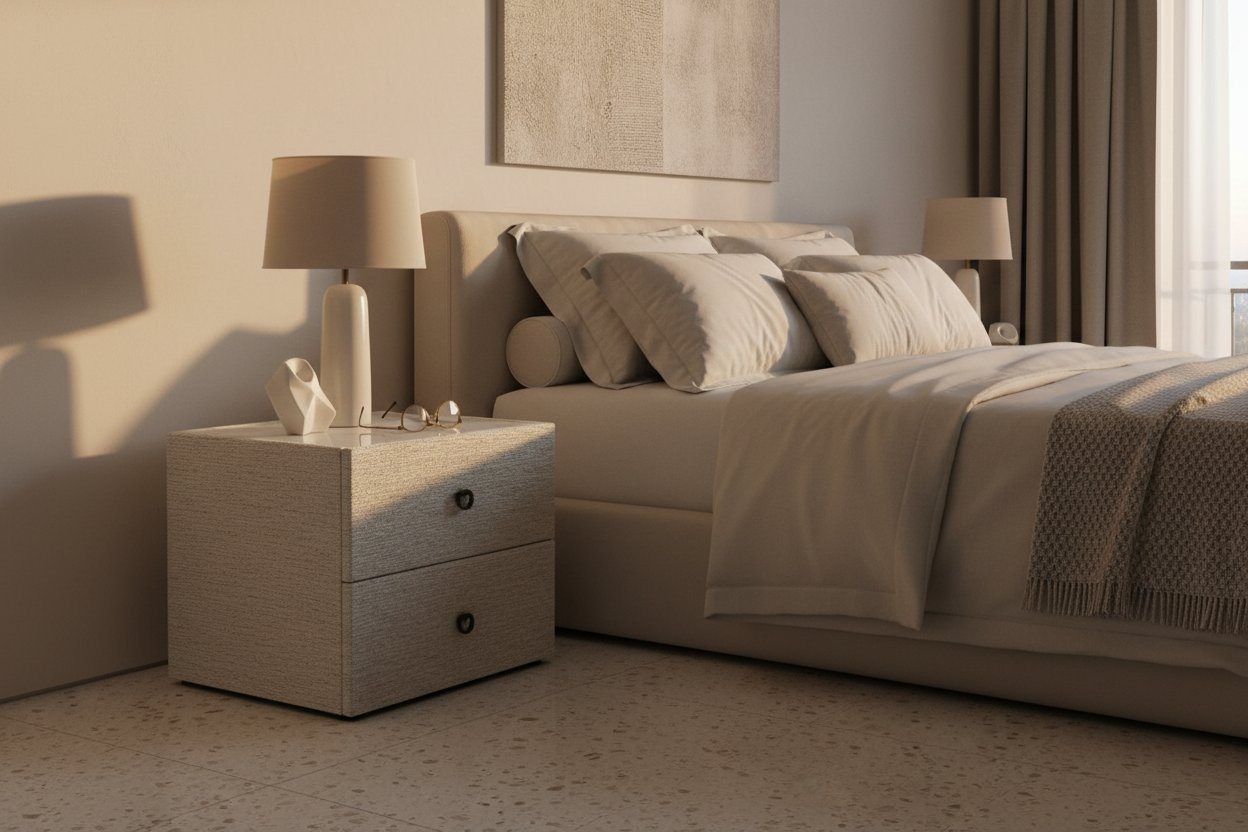 Unlike traditional wood nightstands, the Casa Tessuto brings a softer, more inviting aesthetic to your bedroom. The fabric upholstery creates a warm, cozy atmosphere while maintaining the refined elegance expected from premium furniture. The gentle texture adds depth and interest, making it a stunning focal point beside your bed.