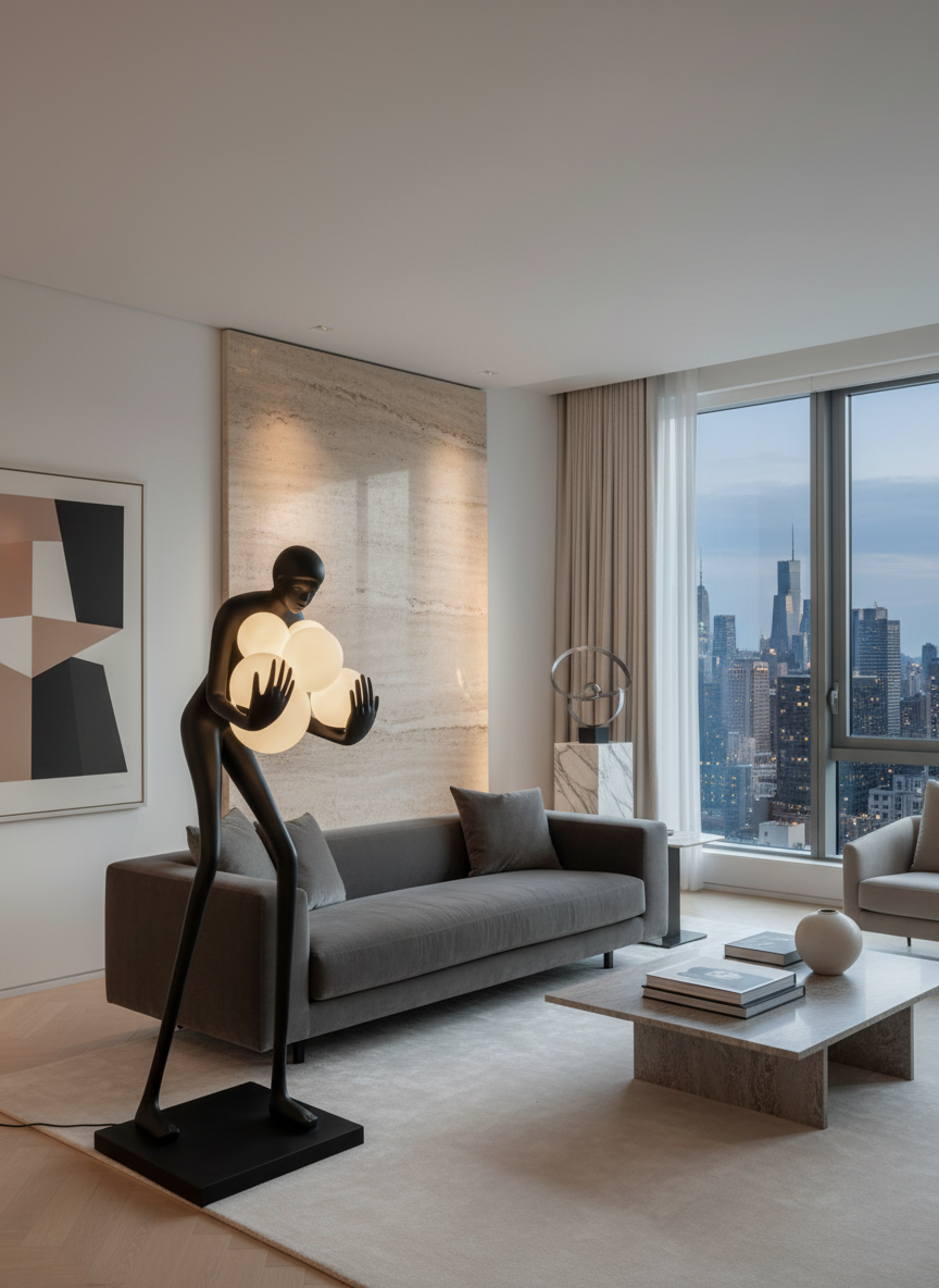 Crafted with a matte black finish, the sculptural form exudes modern sophistication while the luminous orbs provide a striking contrast, creating a harmonious balance of shadow and light. Ideal for luxurious living spaces, serene bedrooms, or art-inspired interiors, the Celestia Protect Floor Lamp is more than a source of light—it’s a symbol of care and connection, blending functionality with a profound artistic statement.