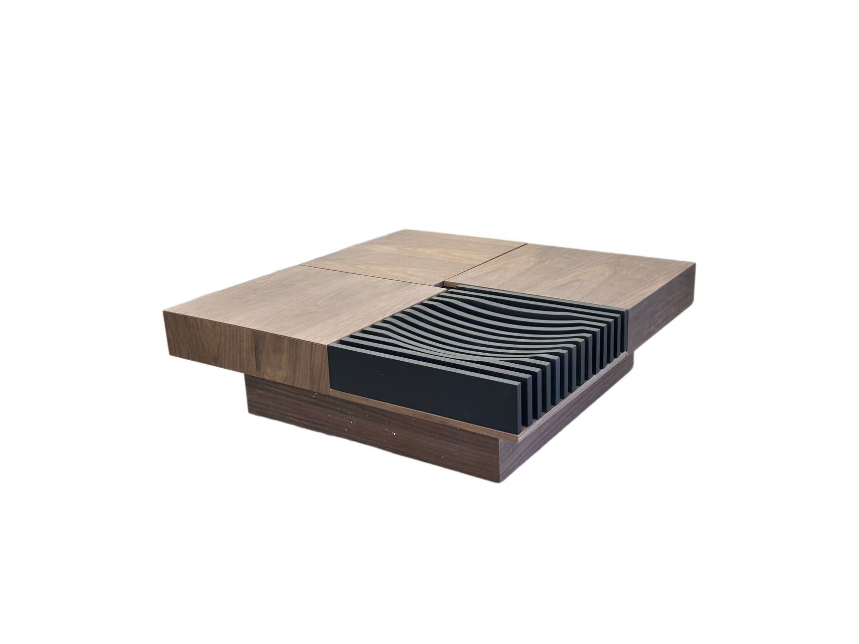 Make a bold statement in your living space with the Axis Modern Square Coffee Table a modern centerpiece that seamlessly blends artistry with everyday utility. Crafted with precision from rich walnut-toned wood, this geometric table features a striking design element—an inset wave-like sculptural section made of layered black panels that adds a sense of depth, motion, and architectural intrigue.