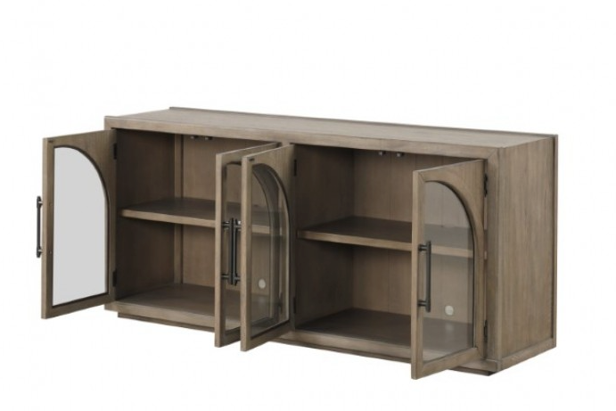 Bring a touch of casual sophistication to your dining or living area with the Clement Modern Farmhouse Sideboard. Crafted from solid rubberwood and oak veneer, this piece balances rustic texture with clean, modern lines. Its four-door arched glass front reveals adjustable interior shelves, offering a stylish way to store serveware, table linens, or decorative accents.