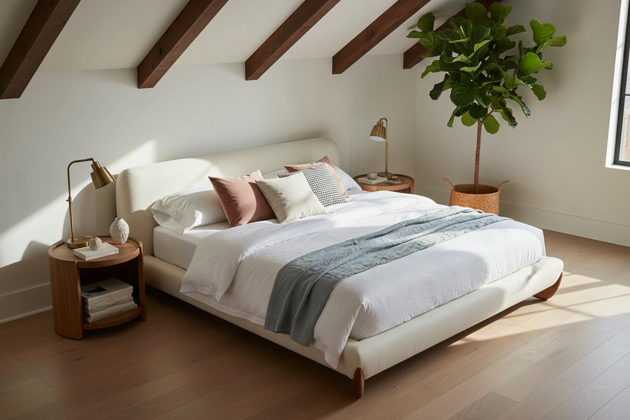 The Coastal Harmony Bed brings a serene and sophisticated vibe to your bedroom with its soft, rounded design and plush upholstery. Inspired by the calm of coastal living, this bed features a gentle, low-profile frame with a minimalist touch, perfectly complemented by its warm wood accents. The smooth curves and padded headboard provide both comfort and elegance, creating a peaceful retreat in any modern space.
