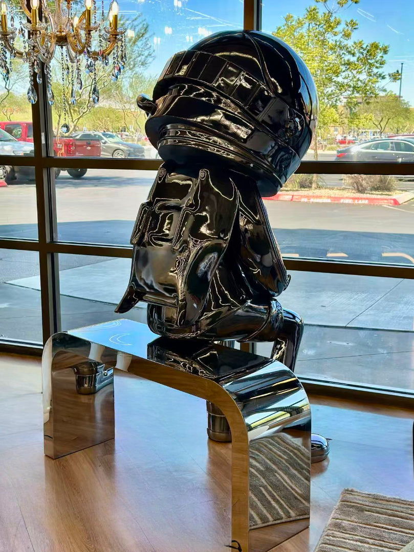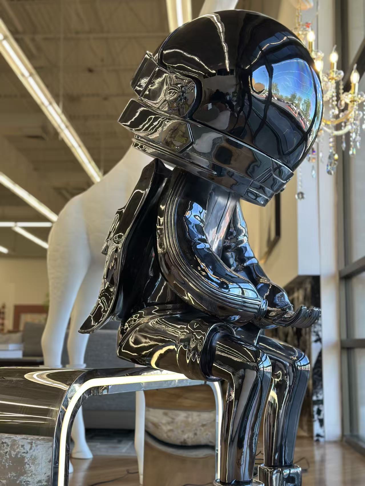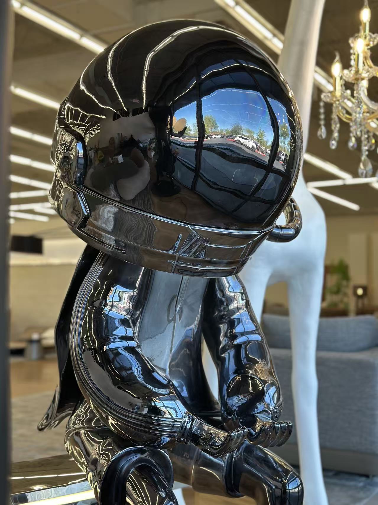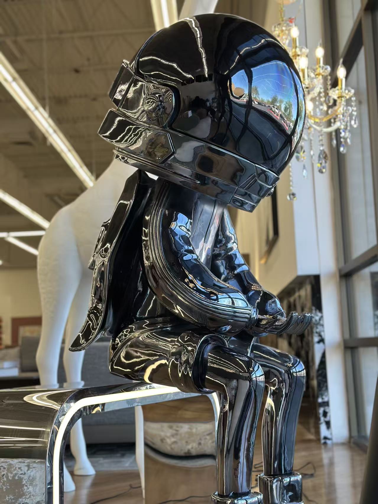 Its smooth, reflective surface and stylized astronaut form create a striking balance between playfulness and sophistication. Whether displayed on a console table, bookshelf, or office desk, it adds personality and a futuristic edge to any space.