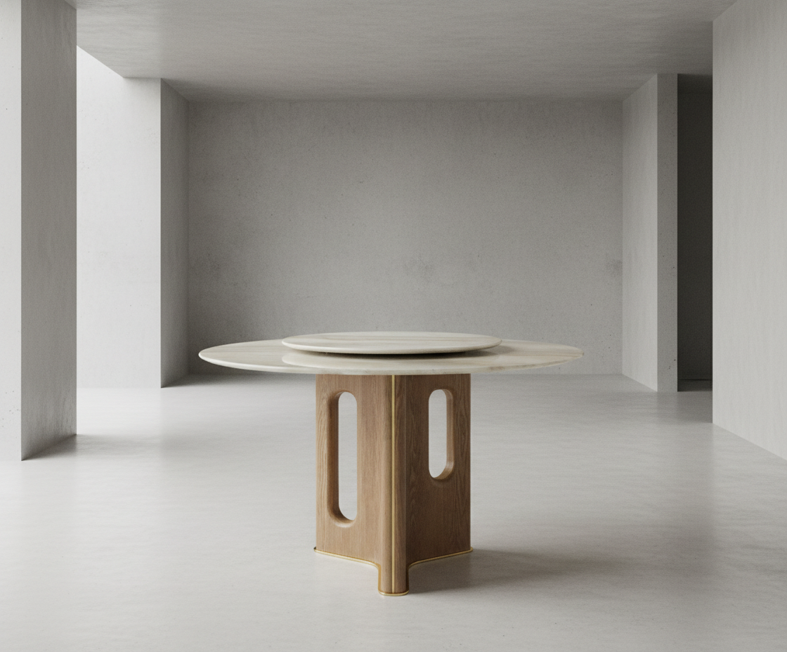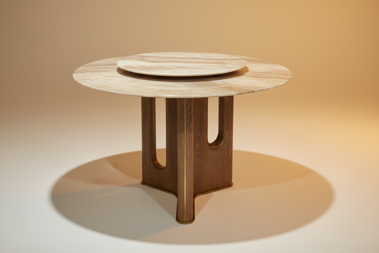 Supported by a sturdy wooden pedestal base with smooth, curved cutouts and golden accents, combining elegance with structural stability. -