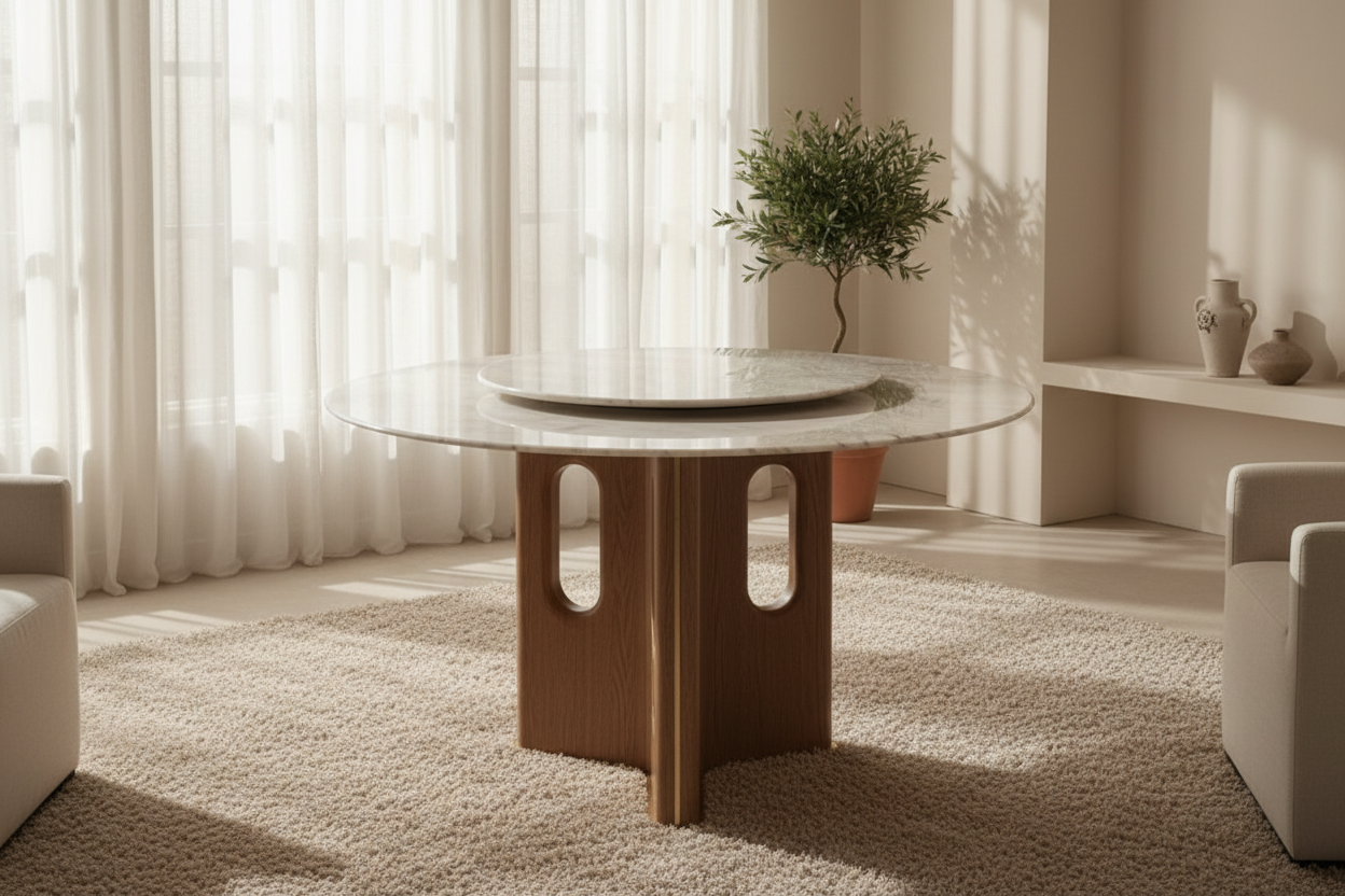 Add timeless sophistication to your dining space with this beautifully designed round marble dining table, perfect for both intimate and social gatherings.