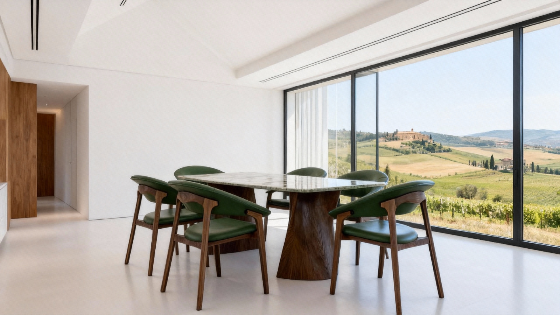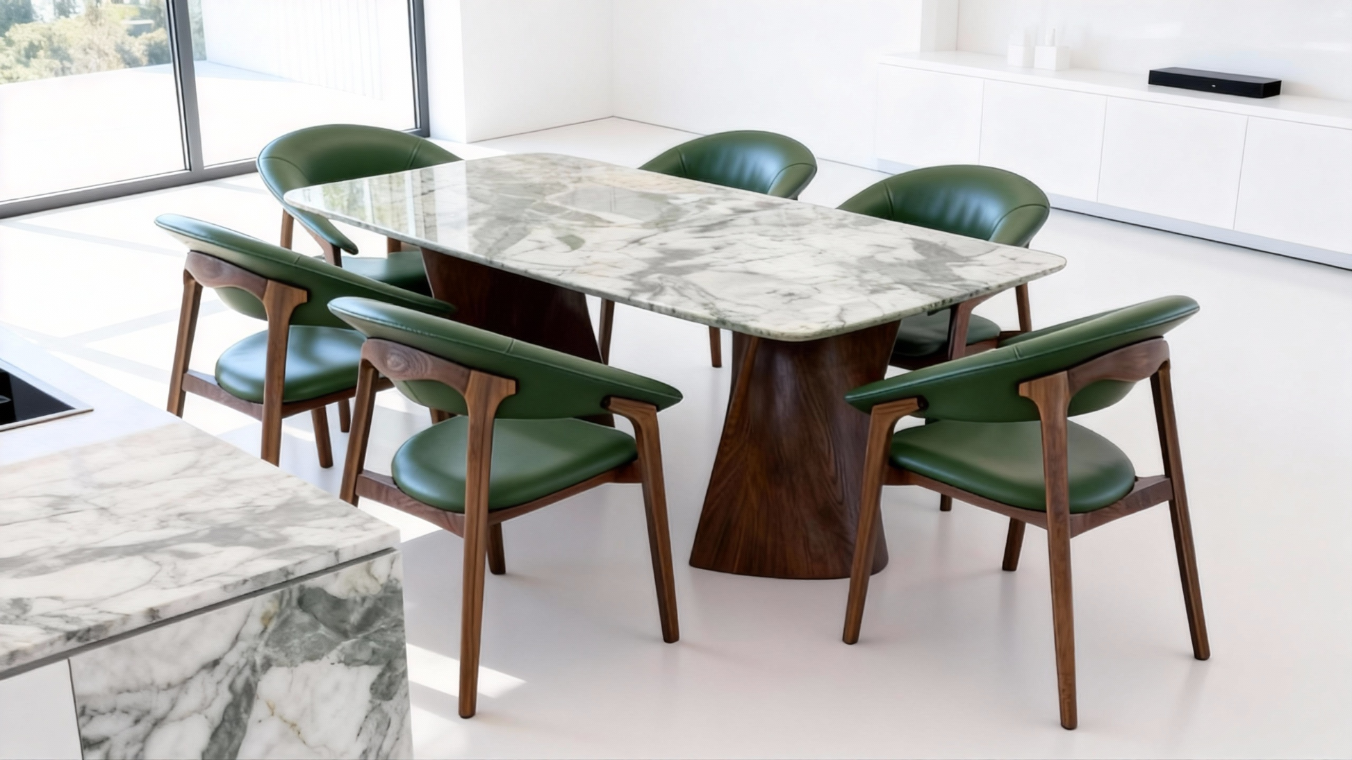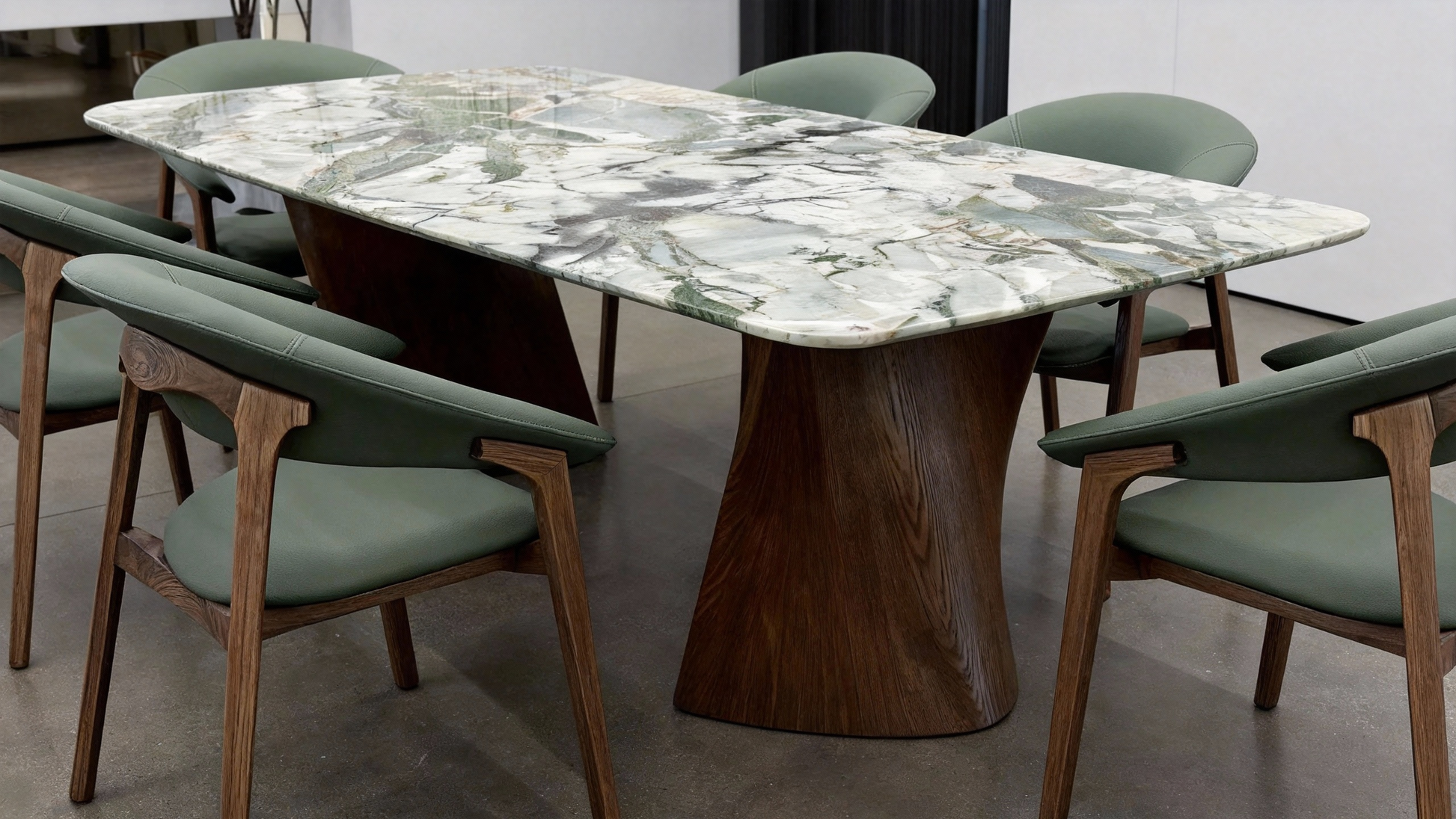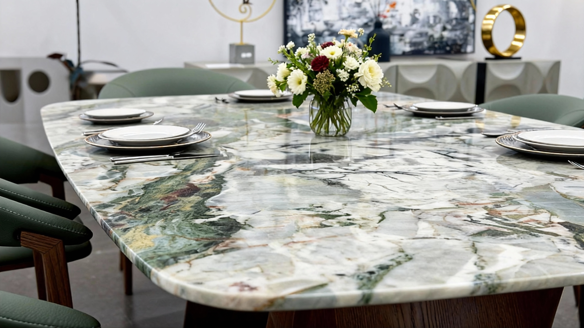 Natural Green Marble Top – Subtle emerald veining dances across a pale stone surface, reminiscent of forest light filtering through leaves.