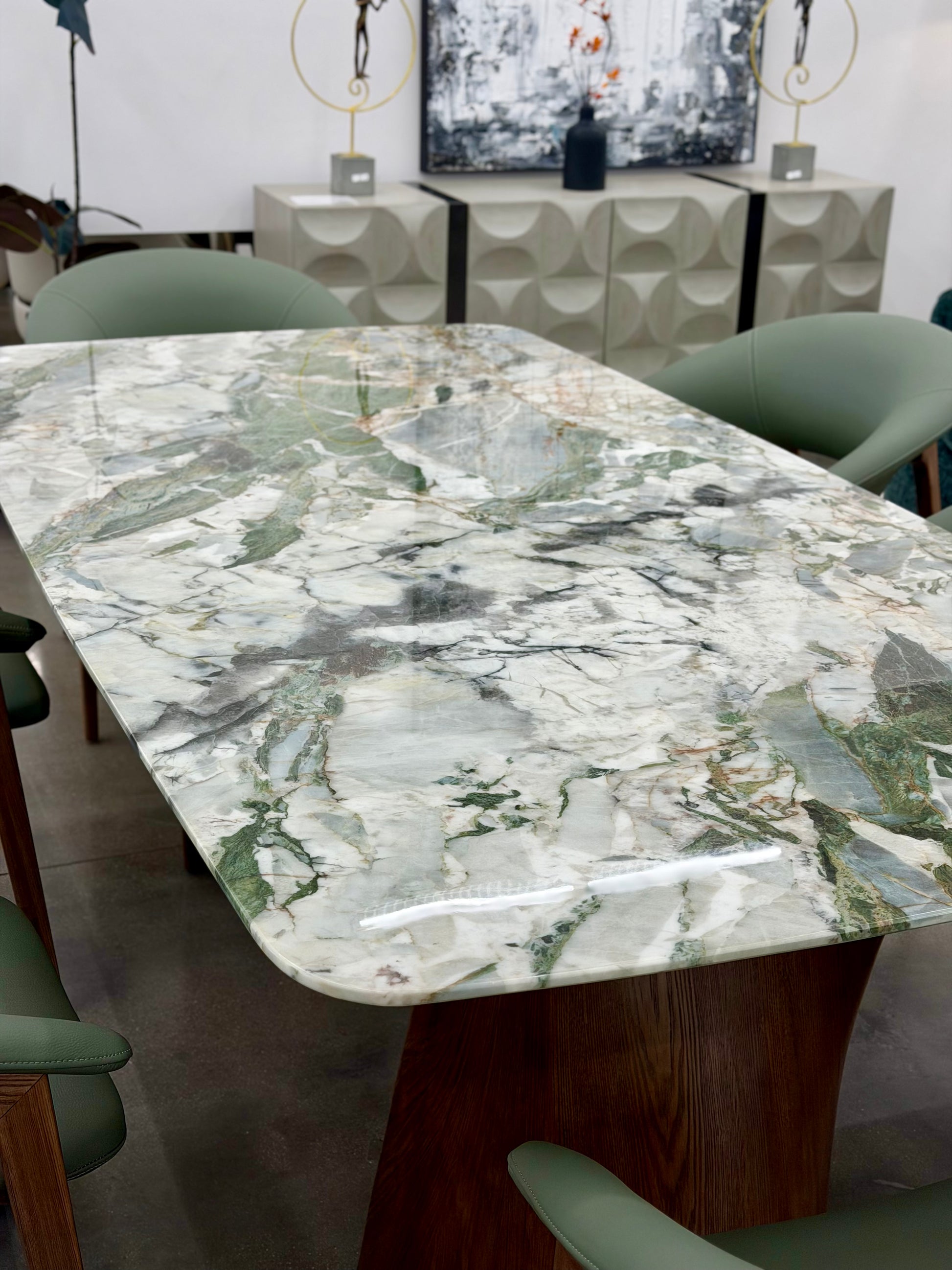 Step into a space where artistry and nature intertwine. The Enchanted Forest Dining Table captures the quiet beauty of the wilderness through its breathtaking green-veined marble top — each piece as unique as the forest it’s inspired by. Supported by a sculptural solid wood base, this table brings together organic warmth and refined luxury, creating a dining experience that feels grounded, timeless, and serene.