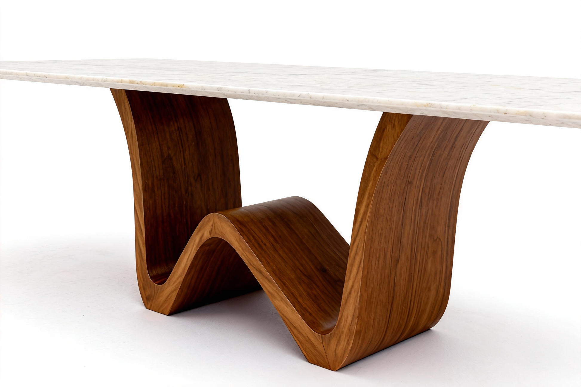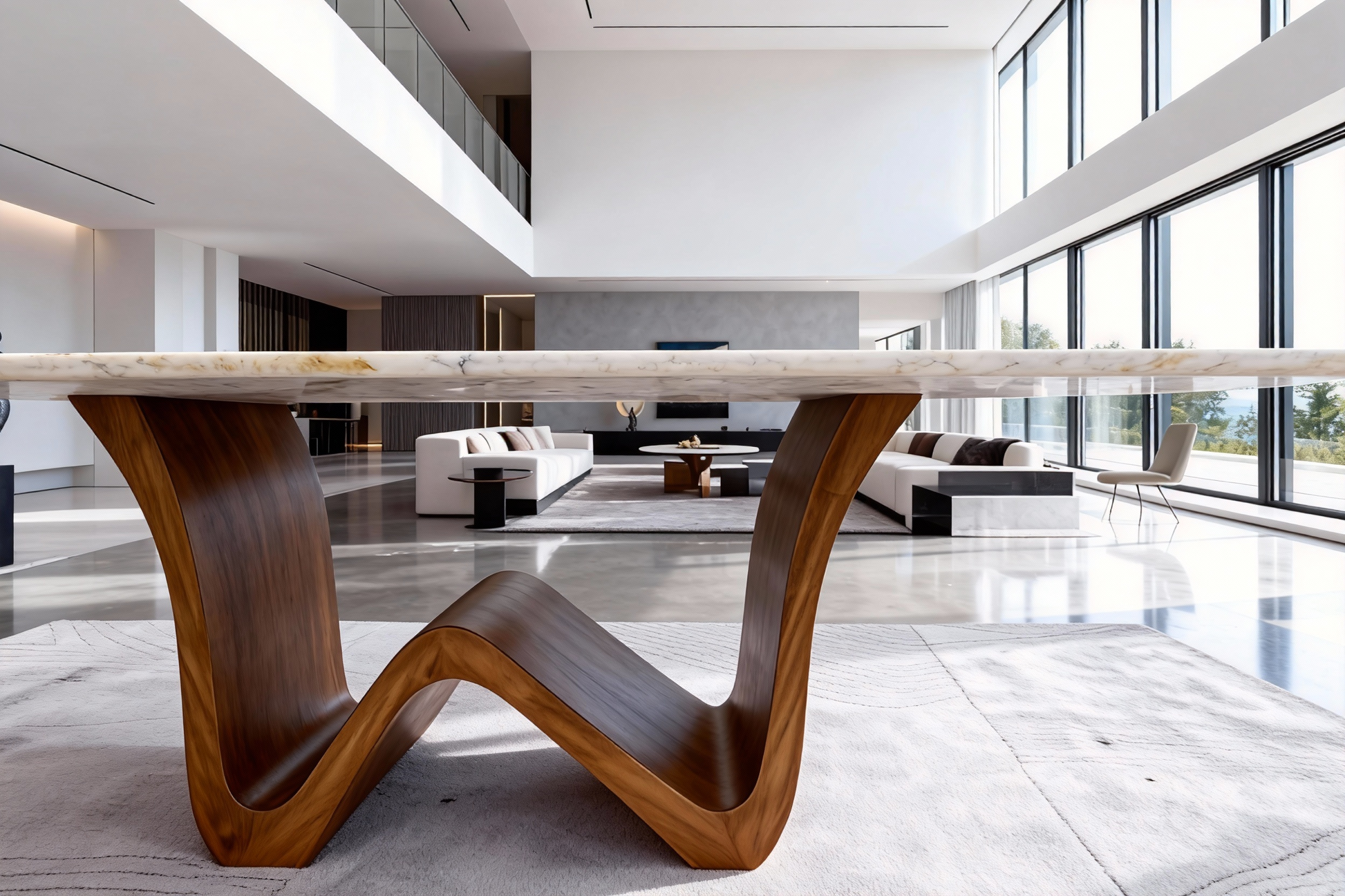 The table rests on sculptural solid wood legs, uniquely shaped to highlight the harmony between stone and nature. Every piece is one of a kind, showcasing the raw artistry of natural materials.