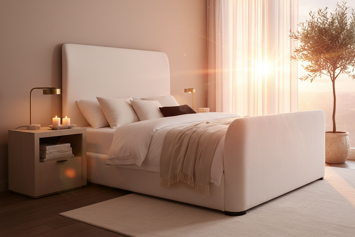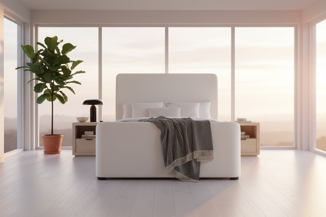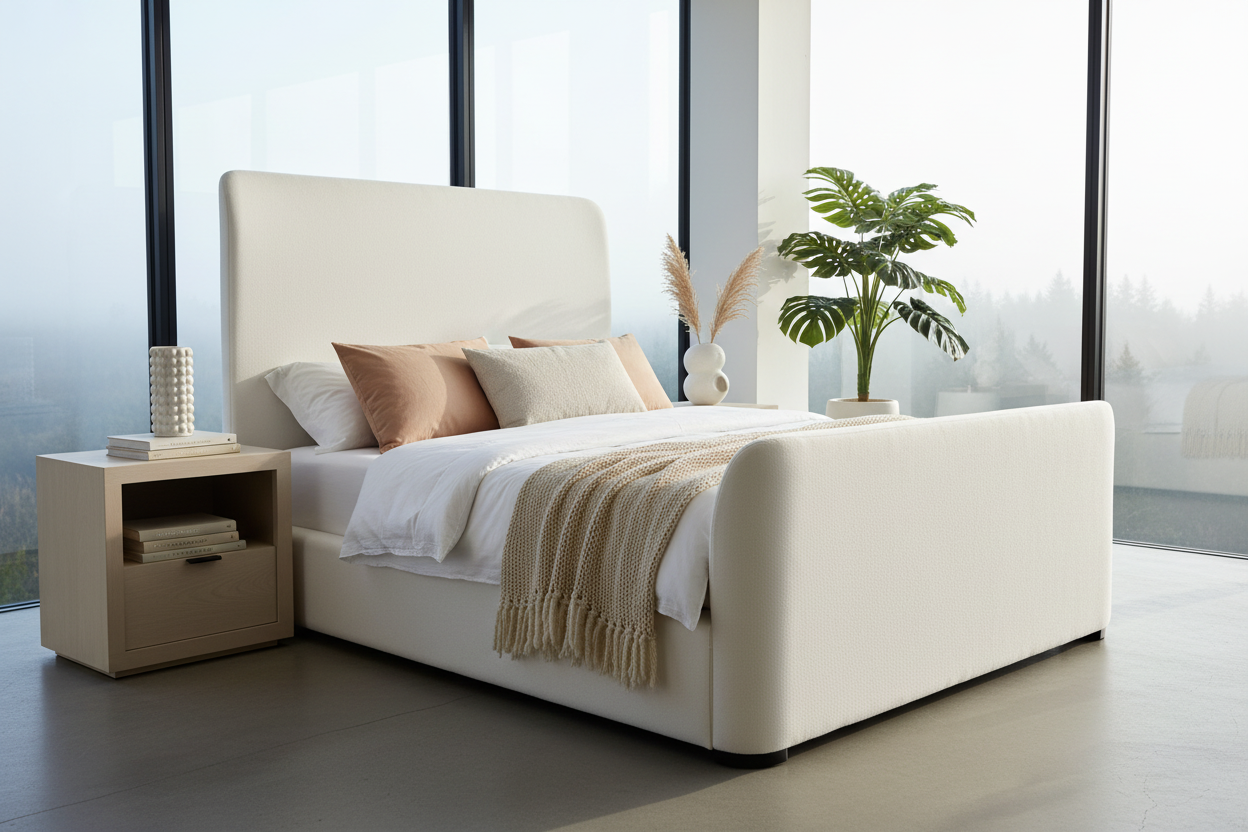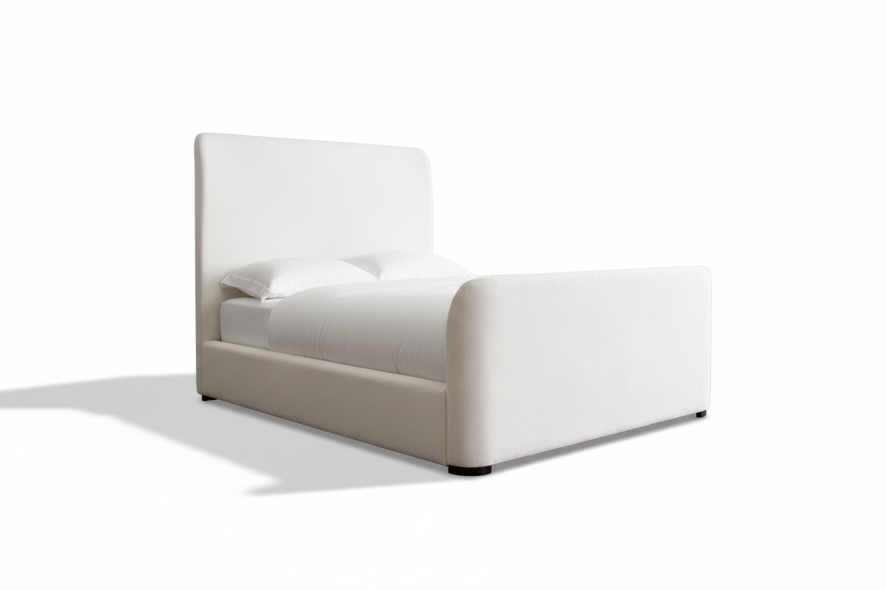 Experience modern elegance with the Eve Upholstered Sleigh Platform Bed, a beautifully designed centerpiece that brings softness and sophistication to your bedroom.