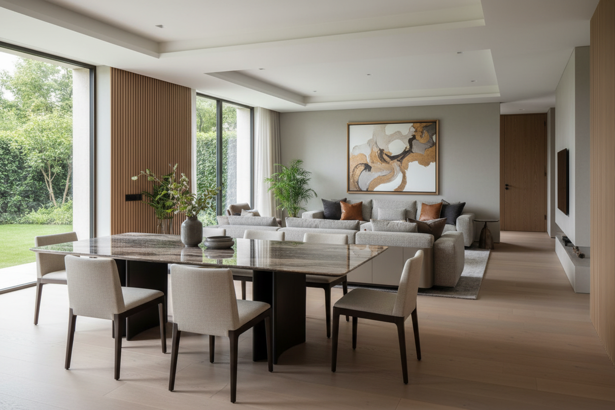 - Rich wood tones add warmth and organic beauty to the contemporary design.