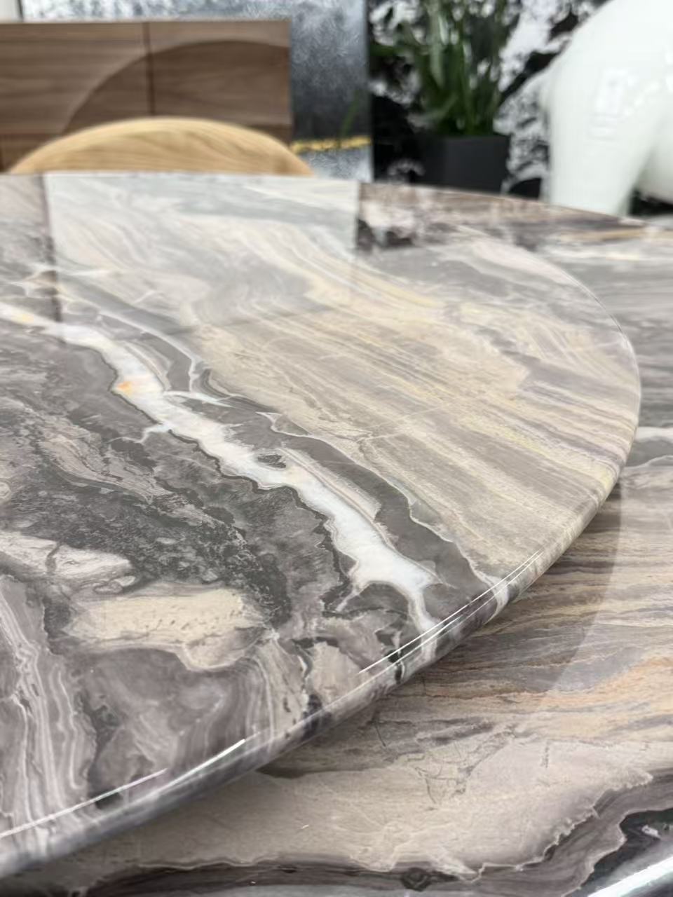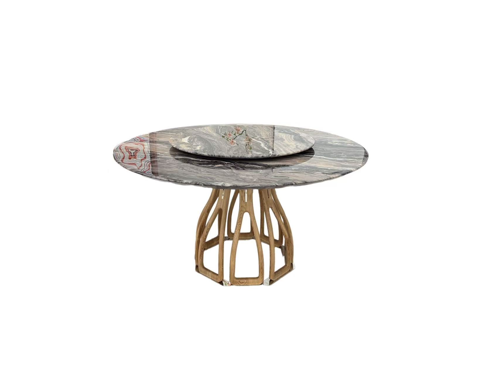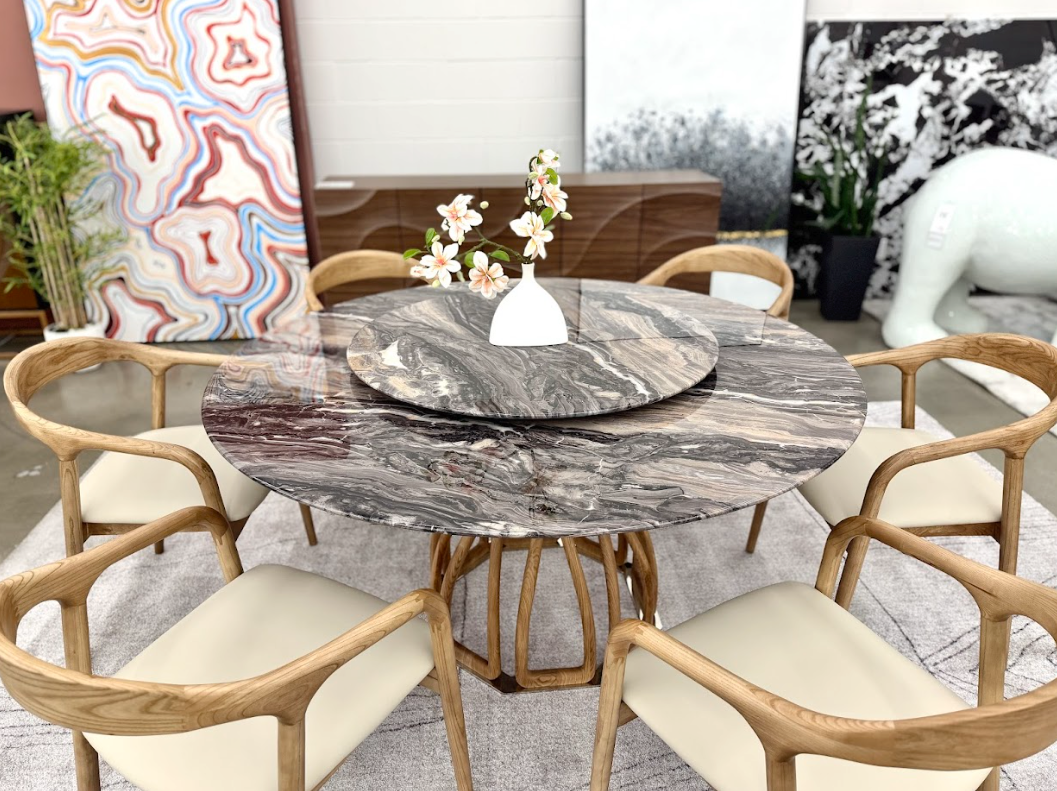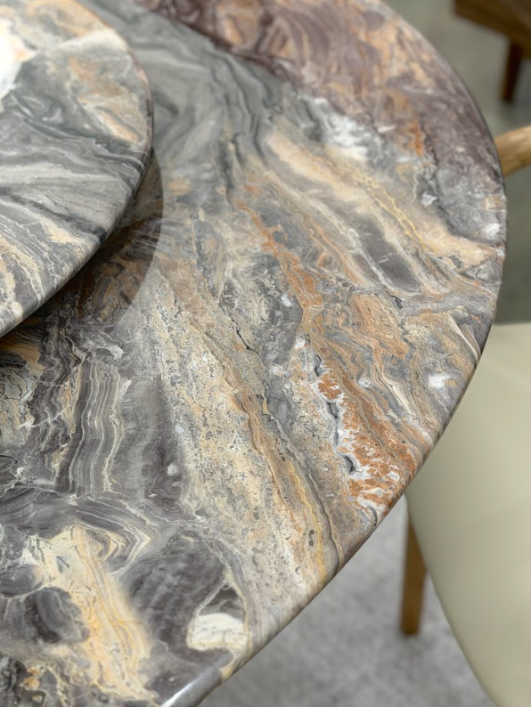 Transform your dining space with the Flowing Amber Round Table—where nature's fluidity meets contemporary luxury.