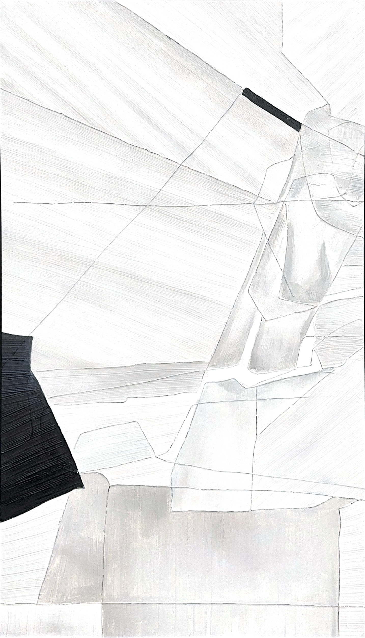 "Fractured Light" is a minimalist geometric abstract painting that captures the purity of form, light, and space. Composed of angular, interlocking shapes in white and pale gray, accented by a bold black element, the piece evokes both architectural structure and the delicate folds of origami. Each plane is subtly textured with directional brushstrokes, giving the painting depth and dimension despite its monochromatic palette.