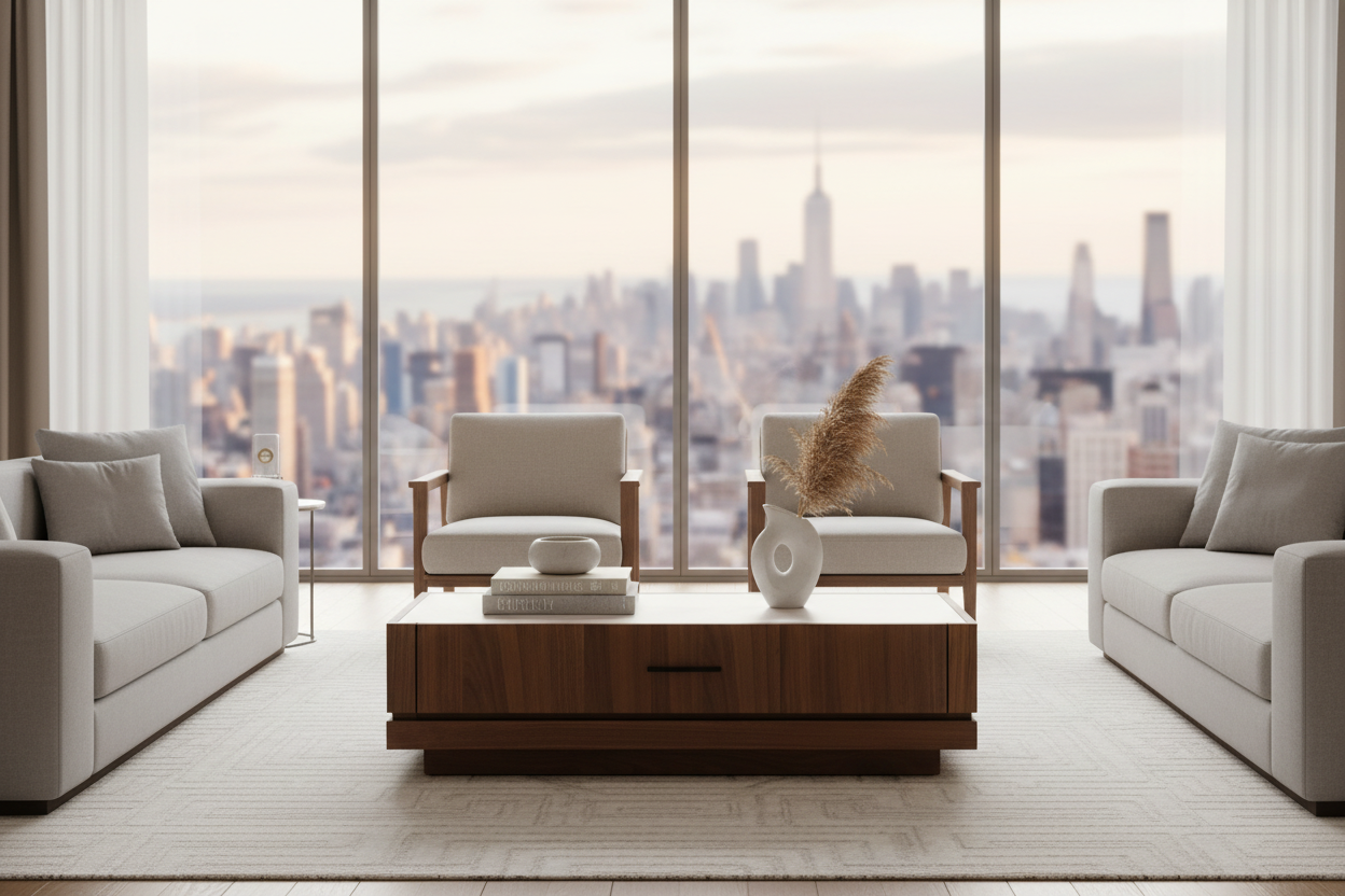 The Gentle Breeze Coffee Table combines modern design with a natural walnut veneer finish, creating a sleek and elegant piece for your living space.