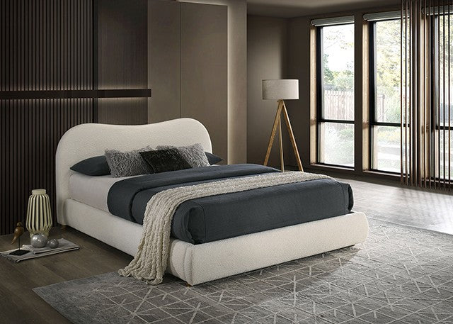Wrapped in soft boucle fabric, the Finamore Bed pairs contemporary elegance with natural warmth. Its gently curved headboard and rounded bun feet create a refined, inviting look. Built with solid rubberwood and a mattress-ready platform design, it delivers lasting durability, comfort, and style.
