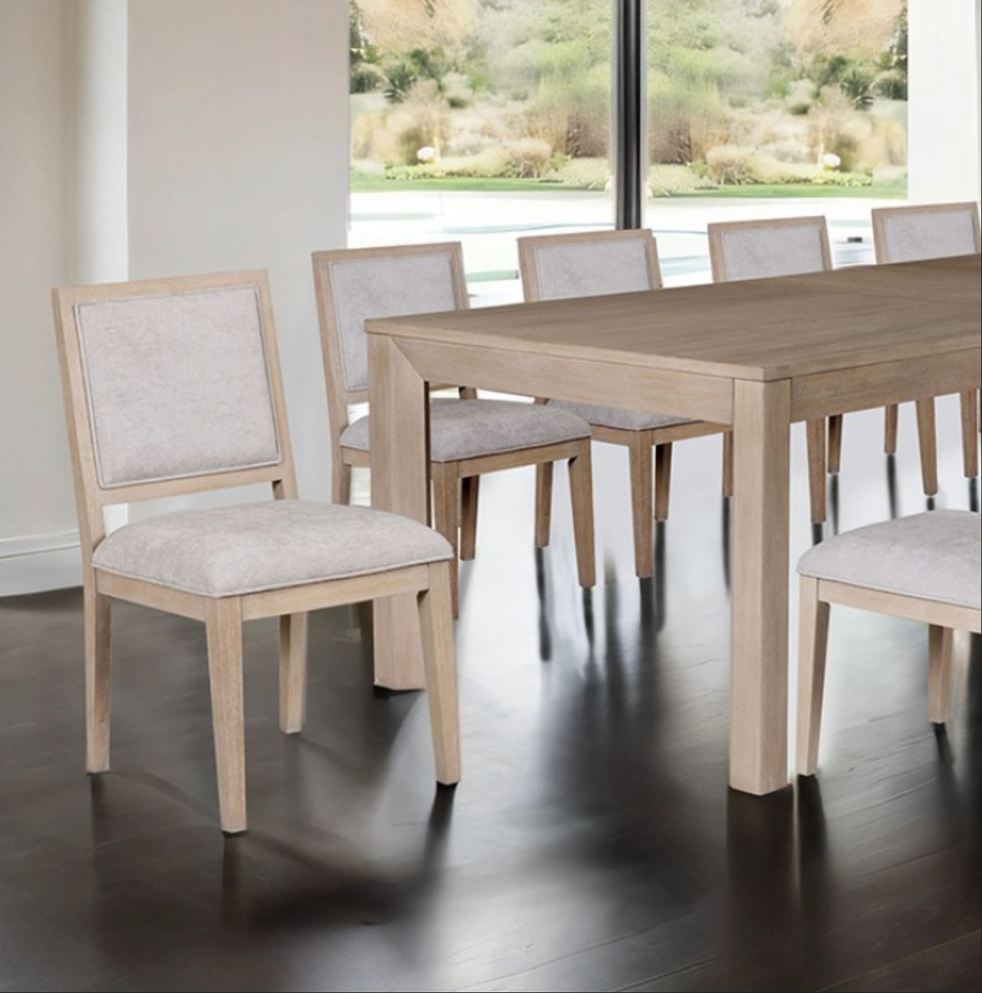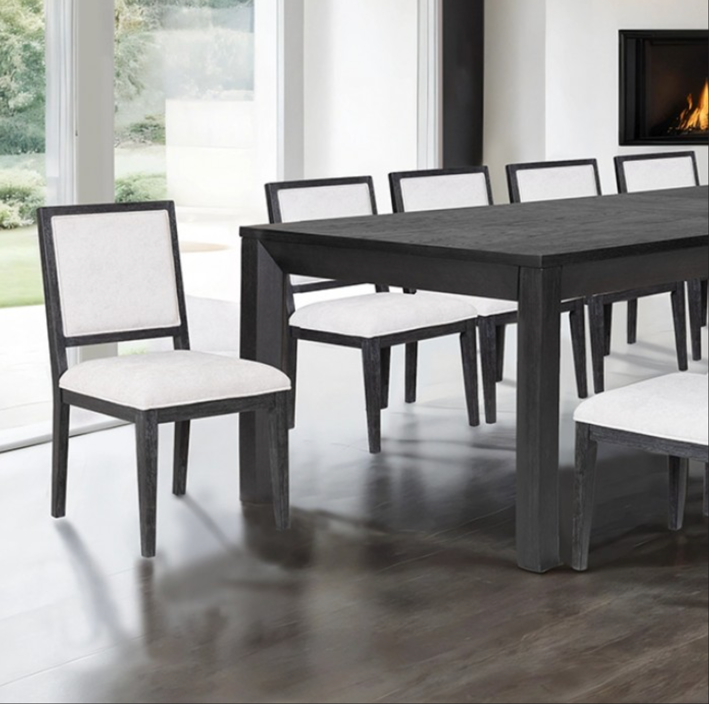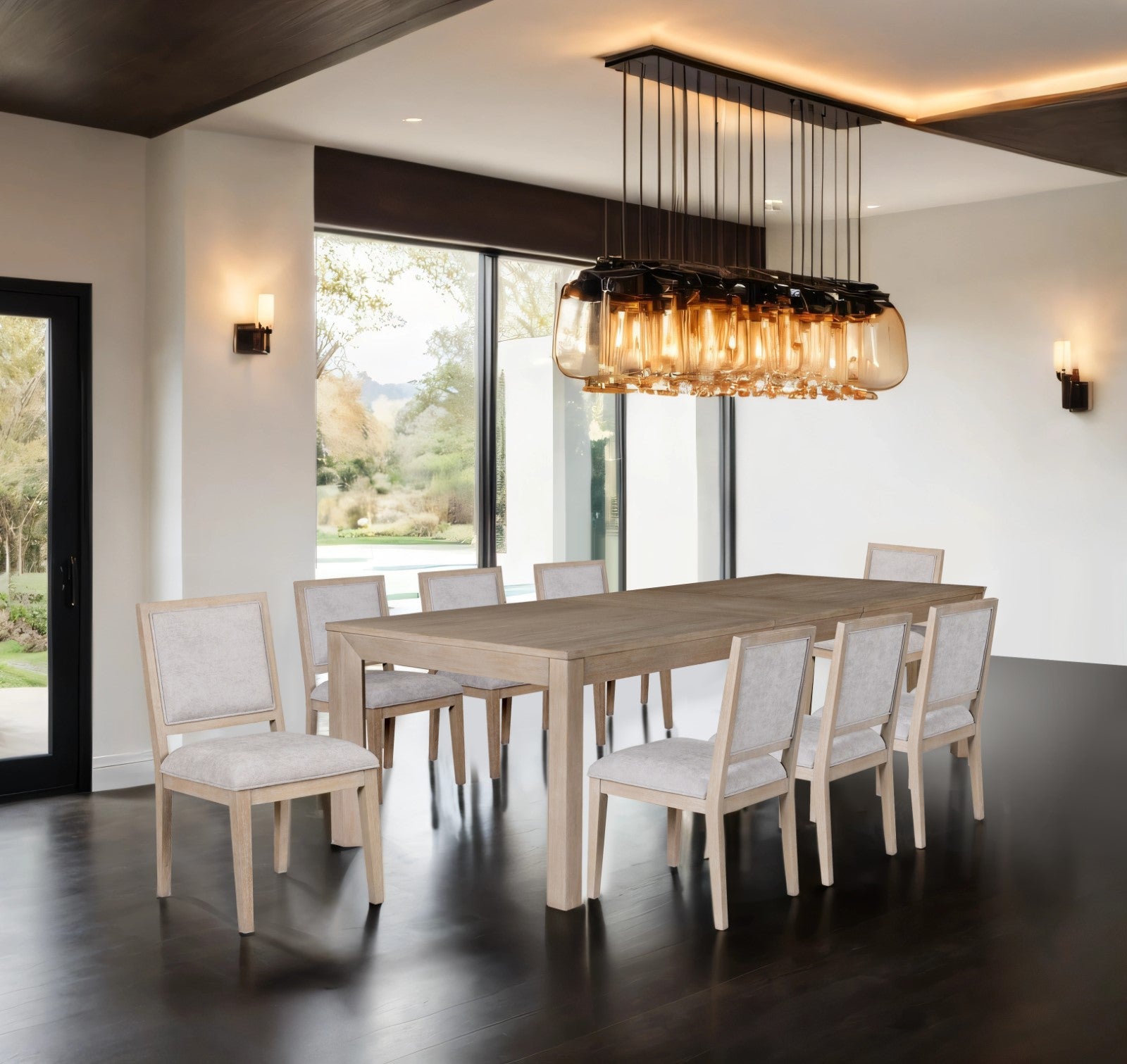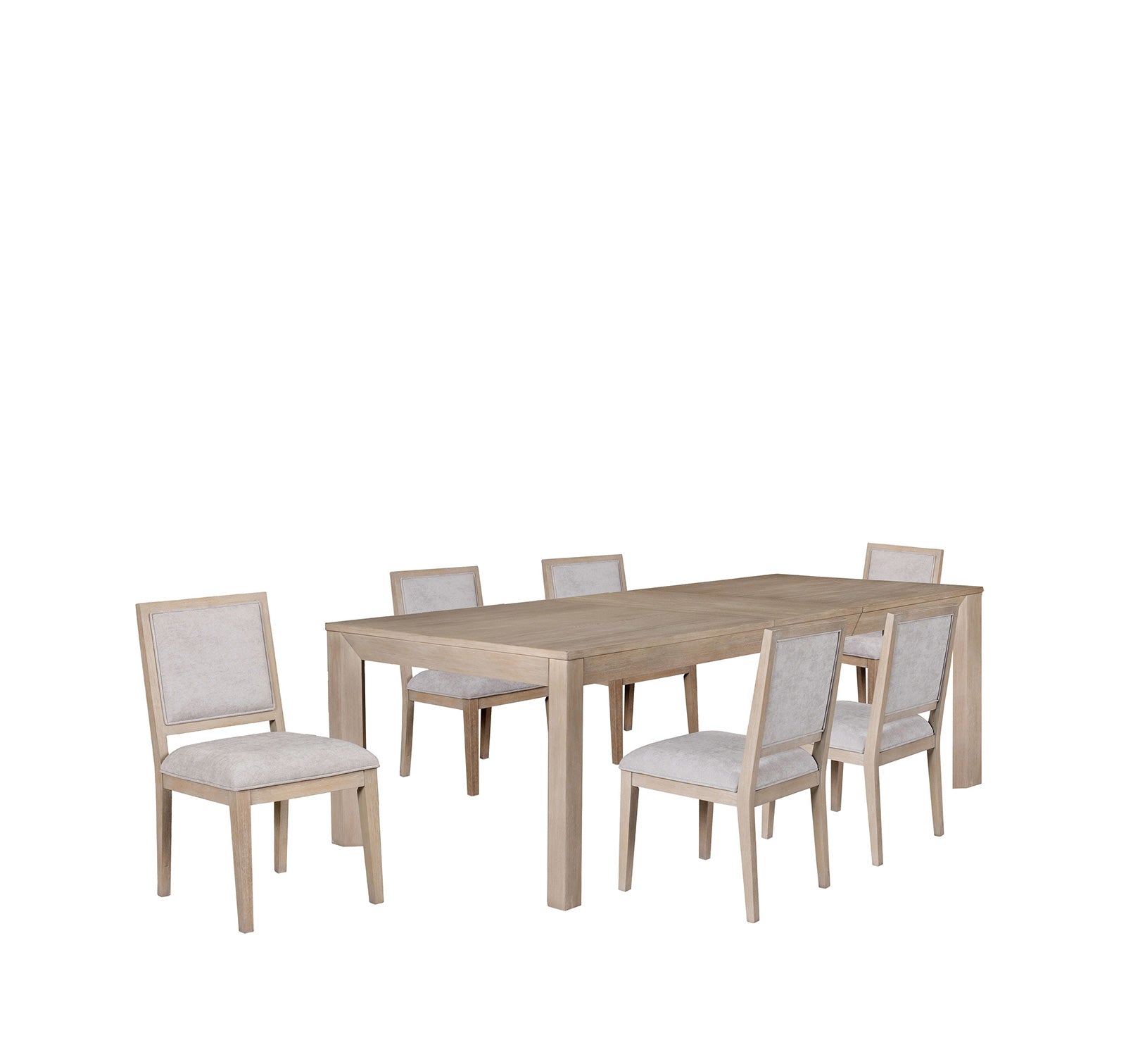 The dining table features a rectangular top with an extendable leaf, allowing seating for intimate meals or gatherings of up to 10 guests. Square table legs provide a sturdy foundation with clean lines, while the chairs offer both comfort and style with thoughtfully crafted details to complement the modern silhouette.