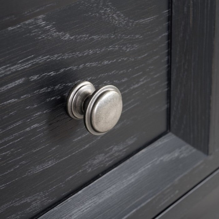 Crafted with solid rubberwood and white oak veneer in a sleek weathered black finish, accented by clean panel details for a bold yet versatile look that complements both modern and transitional interiors.