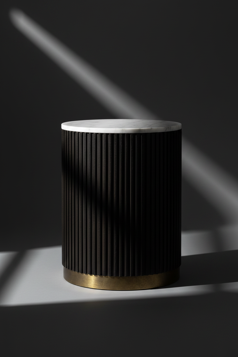 The Hazel End Table is a modern statement piece, combining elegance and functionality with its ribbed solid wood base, marble top, and antique brass accents. Perfect for living rooms, bedrooms, or lounge areas, this end table adds a touch of sophistication to any space.