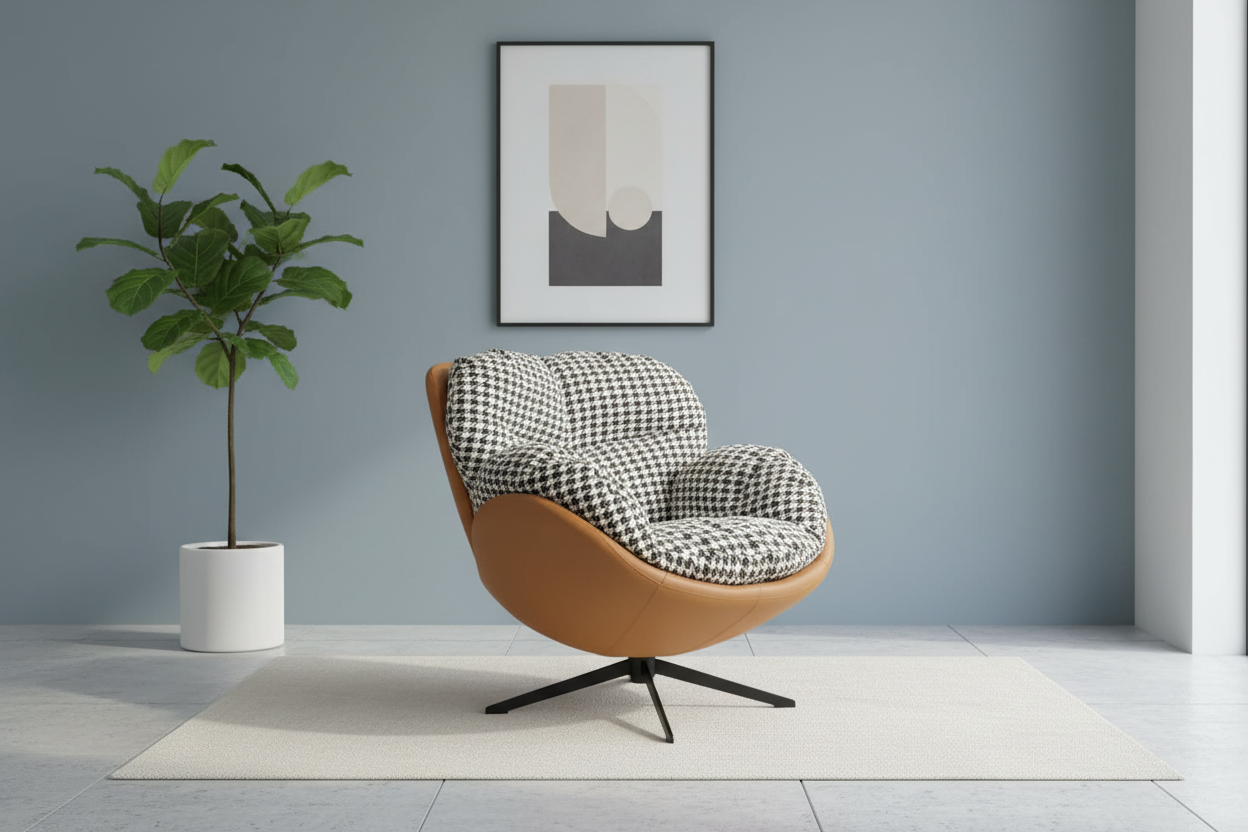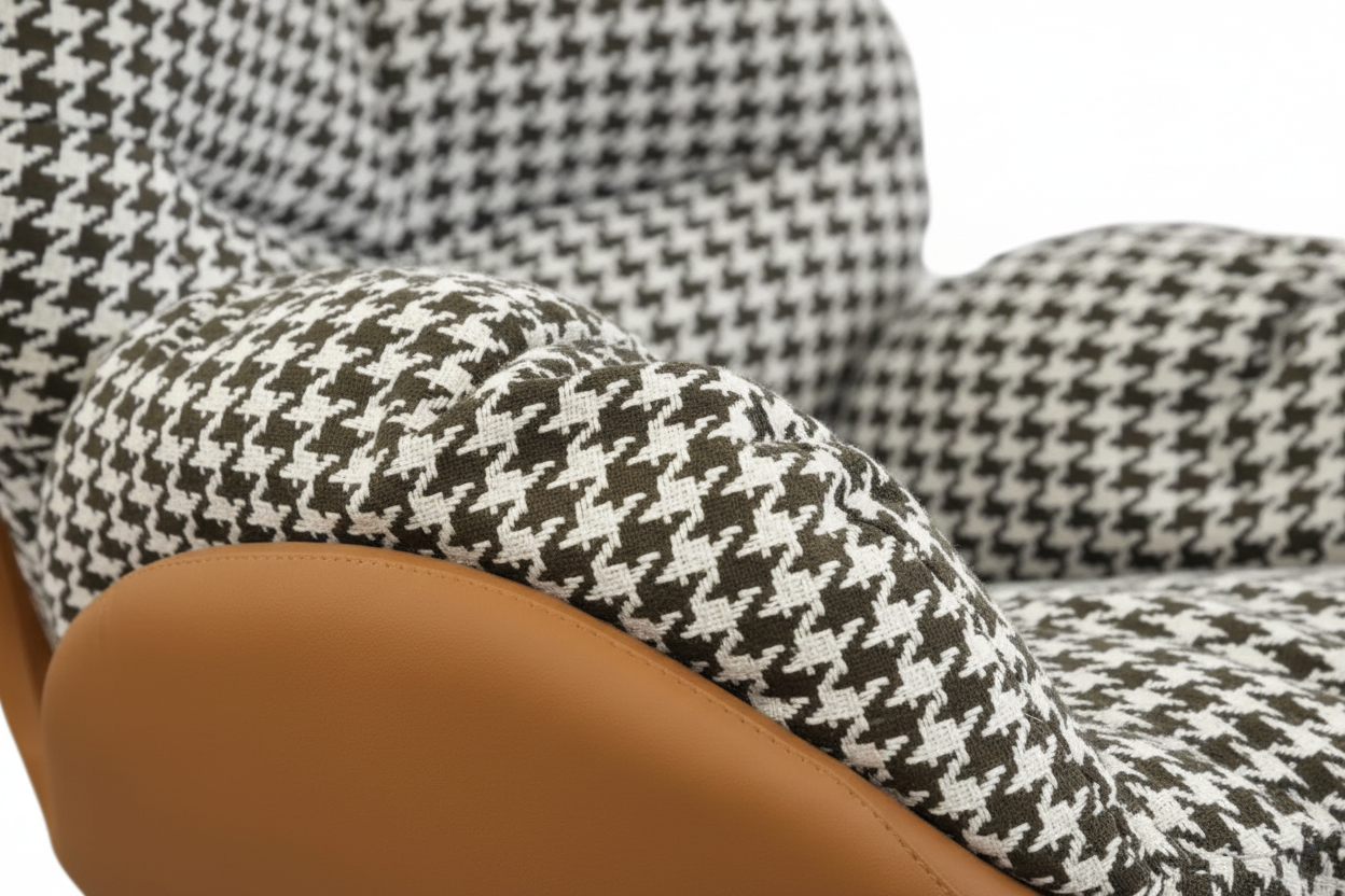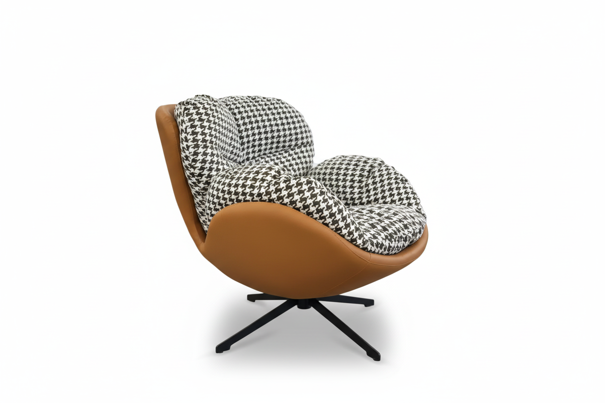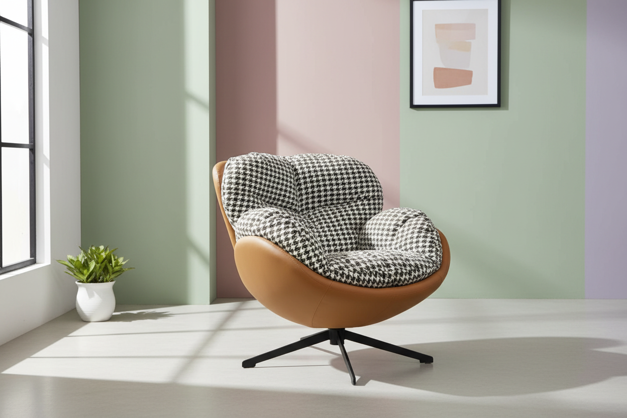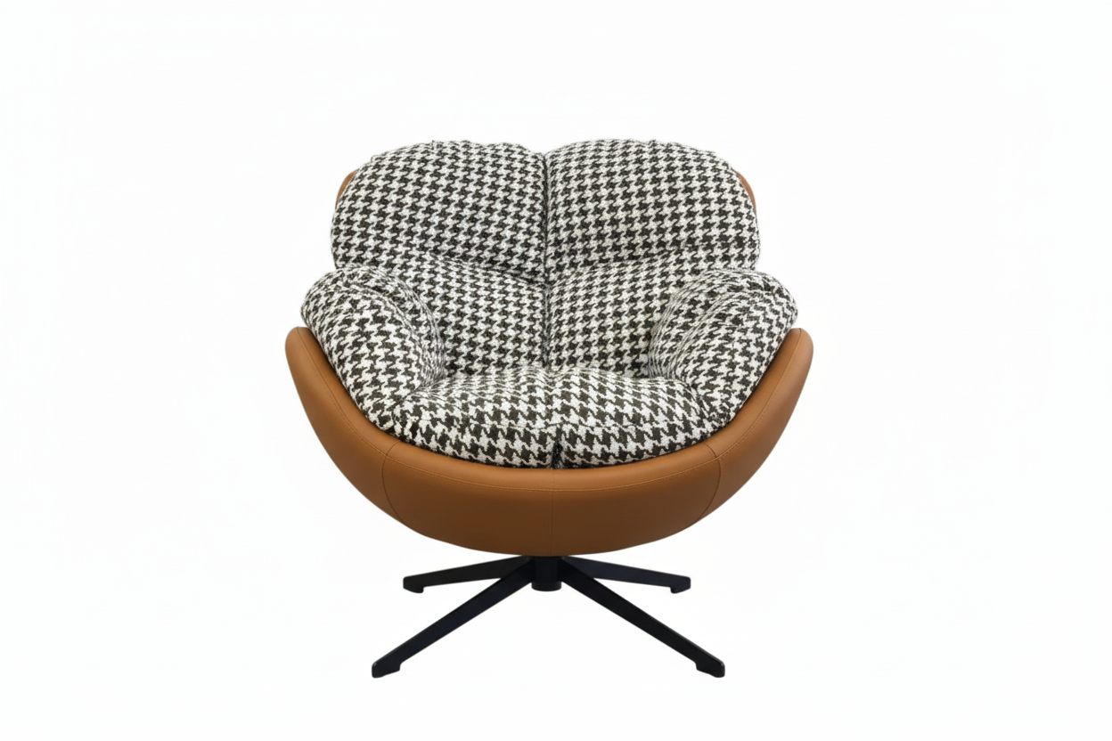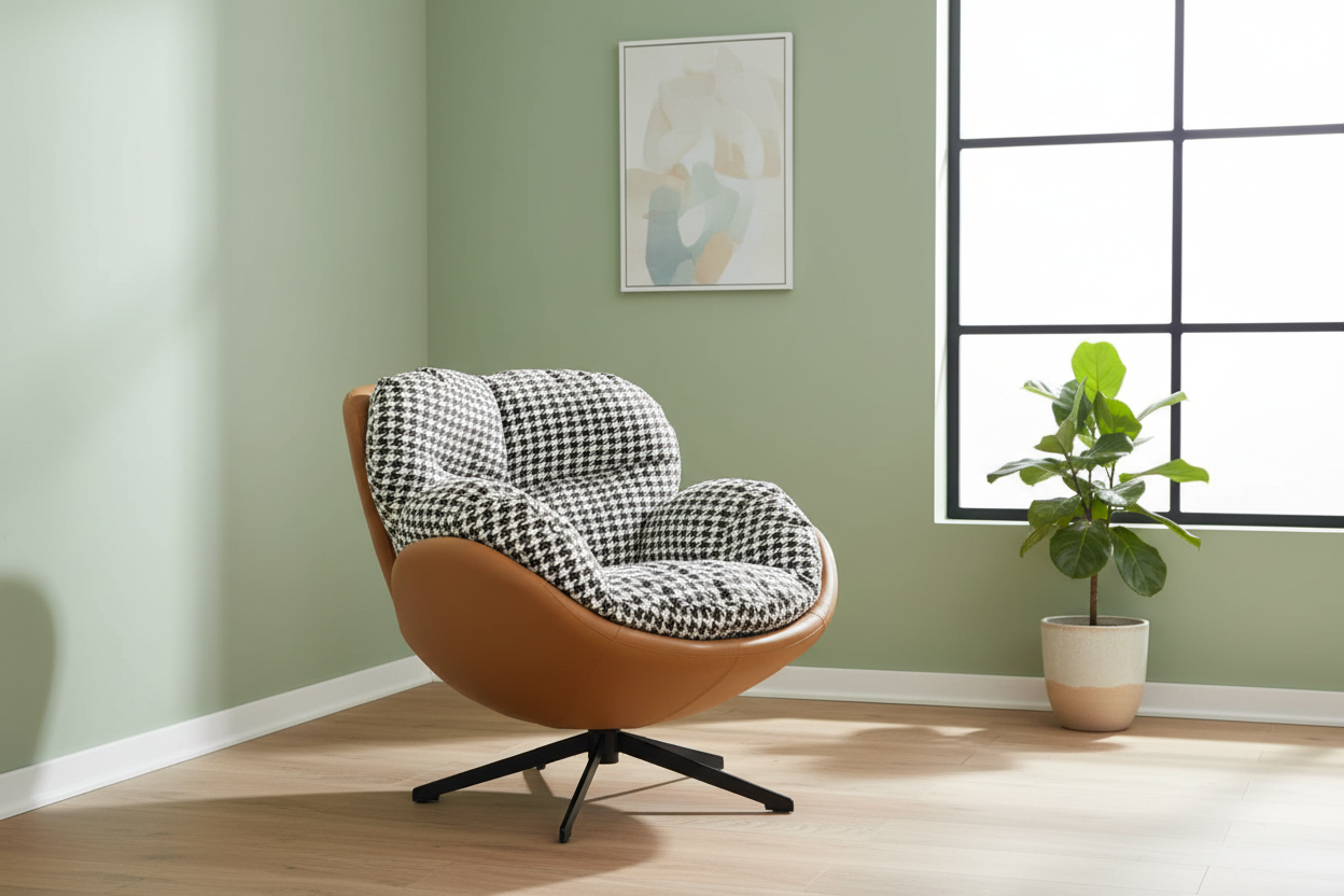 Houndstooth Haven Swivel Accent Chair – Bold Swivel Chair with Houndstooth Upholstery and Leather Trim