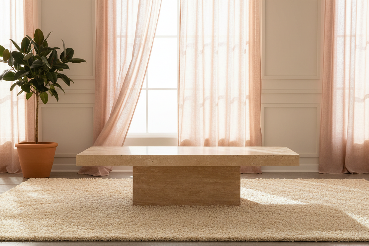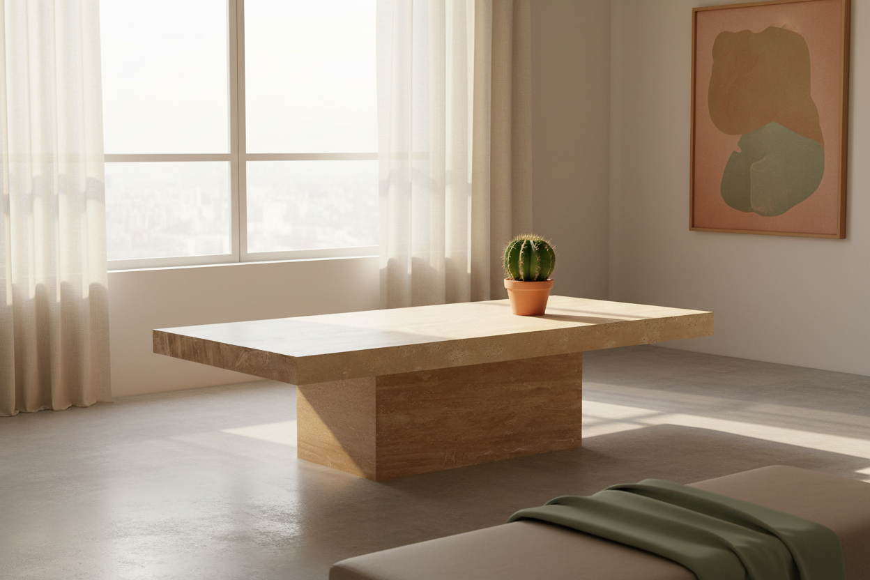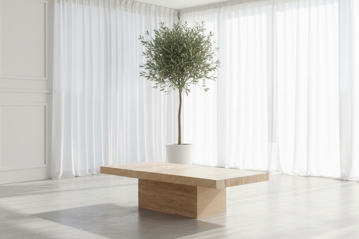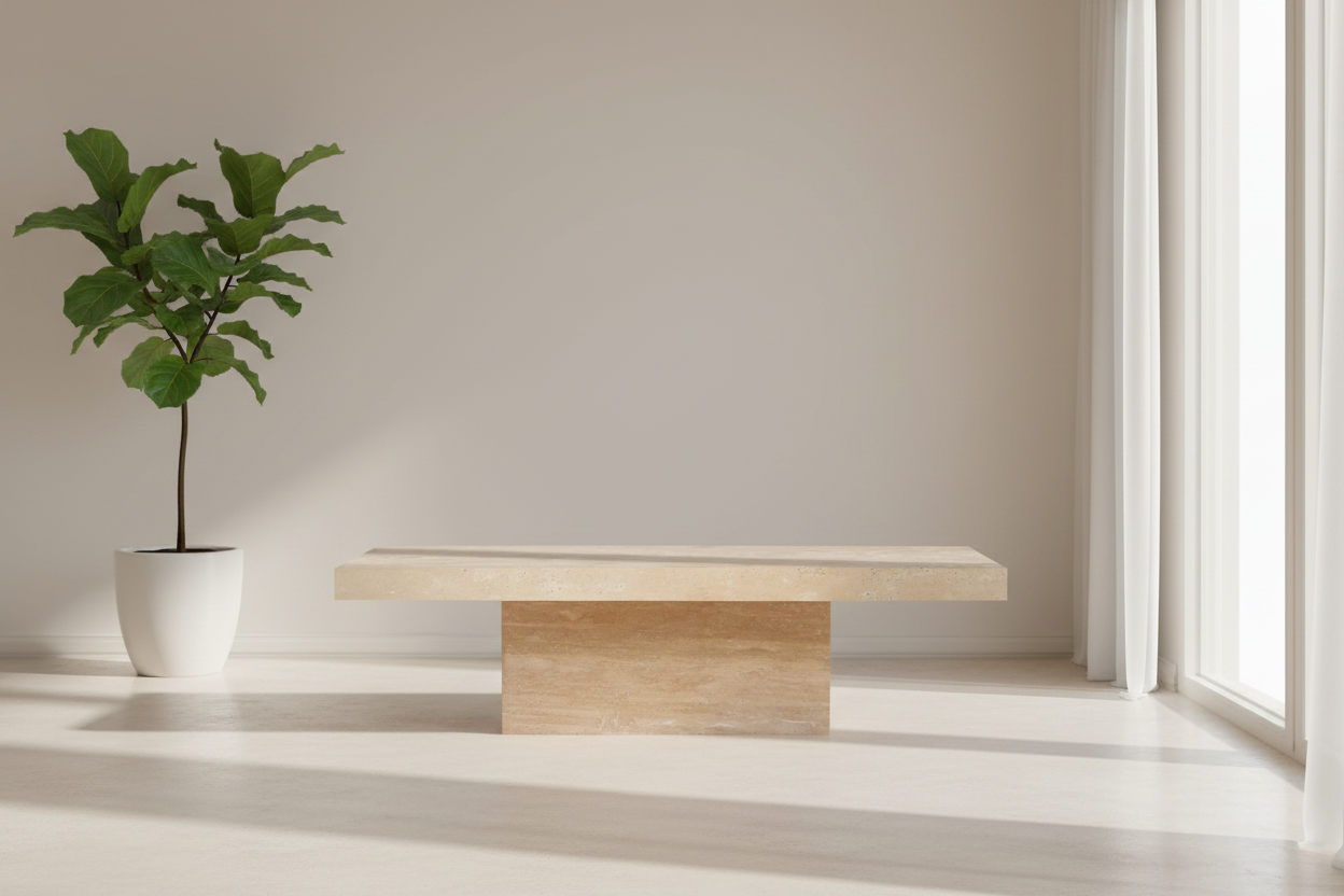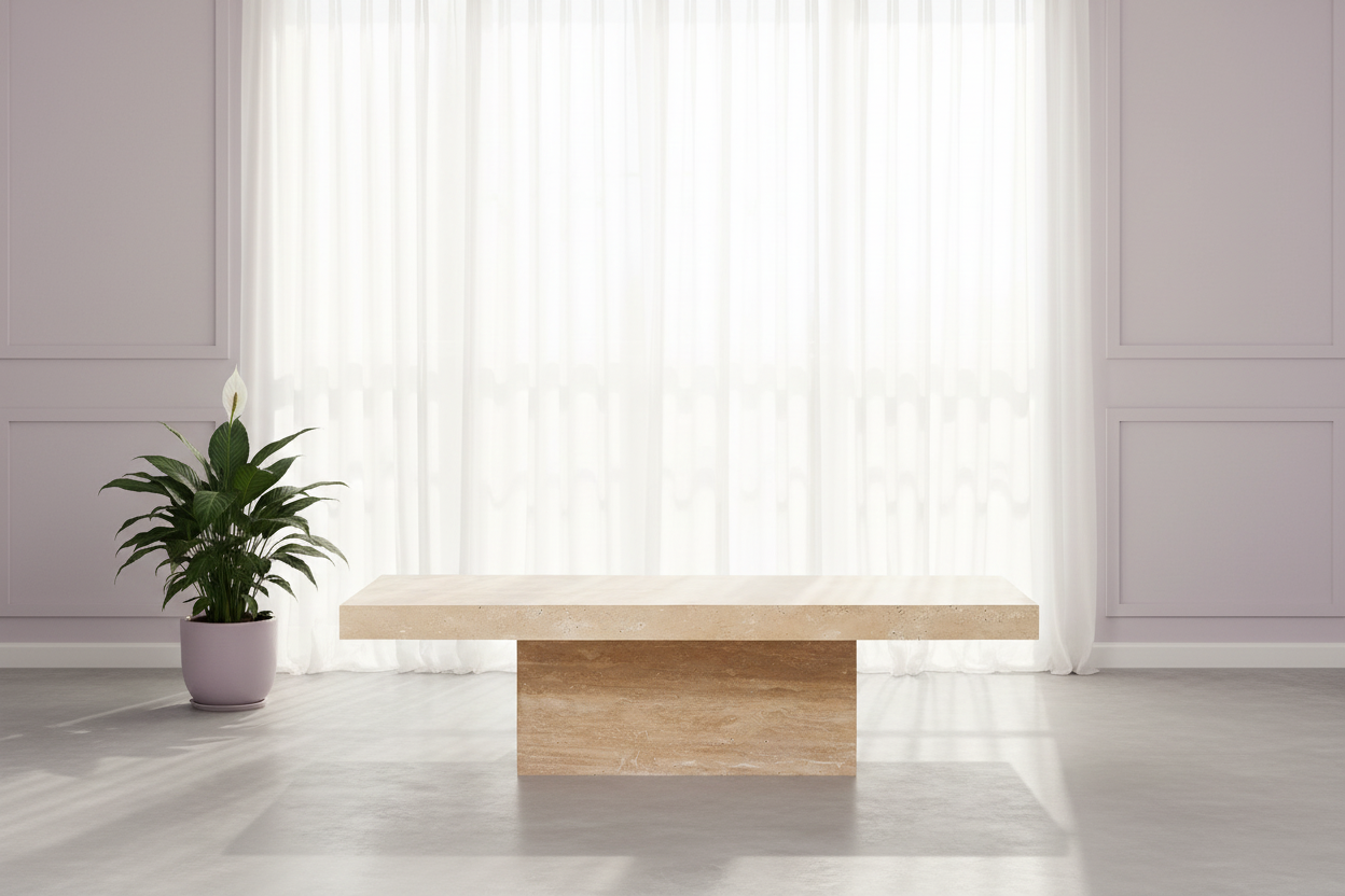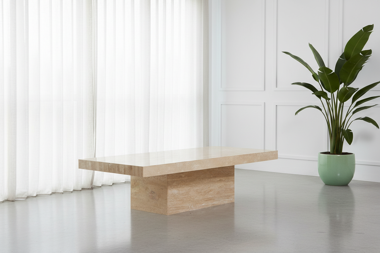 - Handcrafted from thick vein-cut natural Italian travertine with a wood core