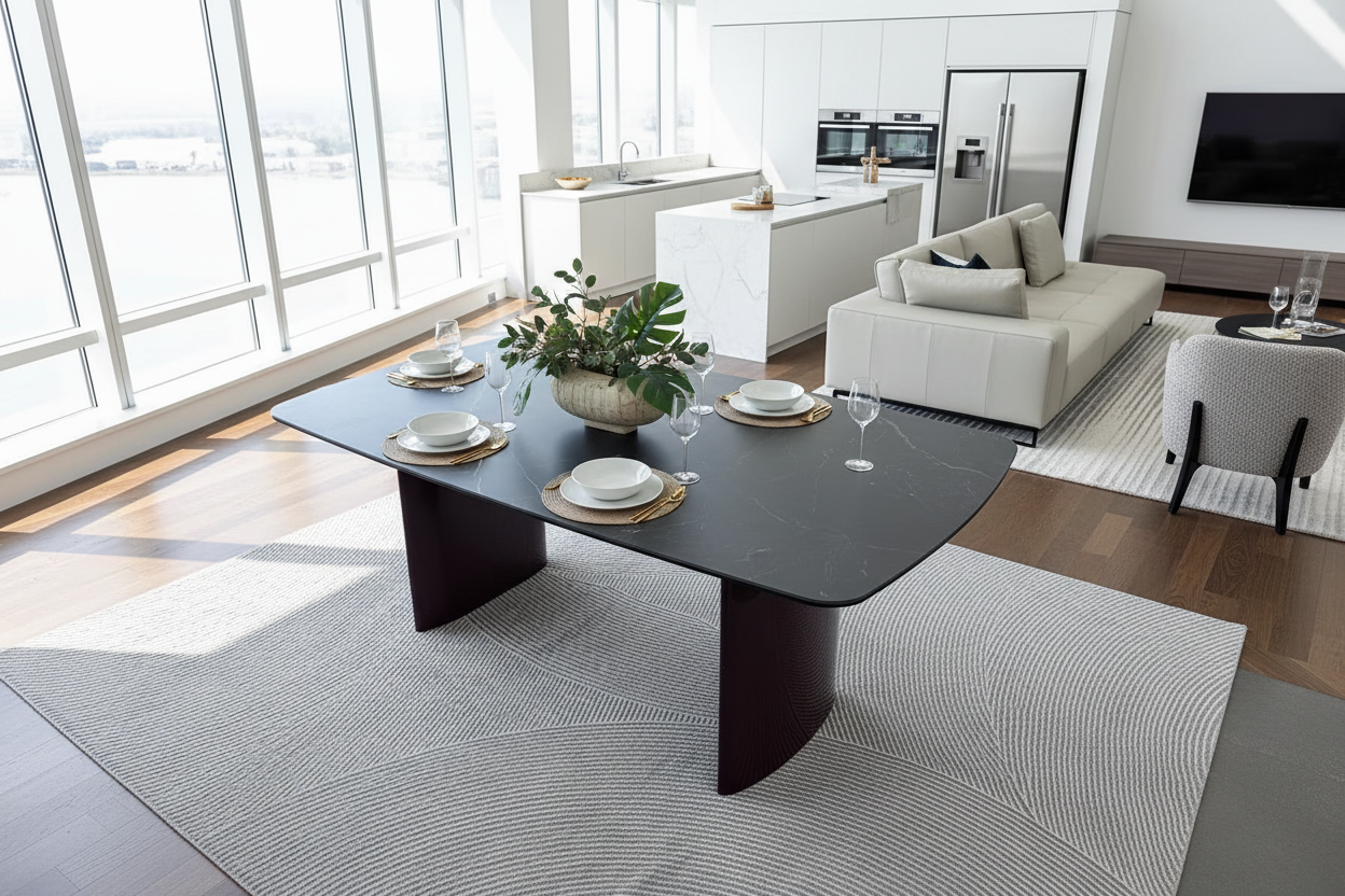 Unlike natural stone, sintered stone is completely non-porous, making it highly resistant to moisture, bacteria, and staining. It won't absorb liquids, requires minimal maintenance, and can withstand hot dishes without damage. The surface is easy to clean with just a damp cloth, ensuring your table always looks showroom-fresh.