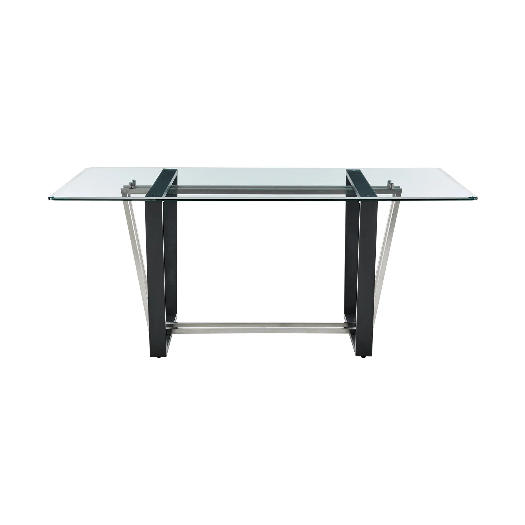 The Kai Rectangular Glass Dining Table embodies modern sophistication with a sleek, transparent glass top and a striking geometric metal base. The combination of black and gold-finished metal legs delivers a contemporary edge while providing a stable foundation. This table is perfect for adding elegance to your dining room, offering a spacious surface for meals, gatherings, or entertaining guests.
