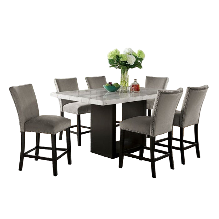 The Kian Counter Height Dining Table is designed for modern sophistication, featuring bold contrasts and timeless materials. With a striking genuine marble top set on a sleek dark wood base, this table blends transitional elegance with contemporary flair—perfect for both casual gatherings and formal dining.