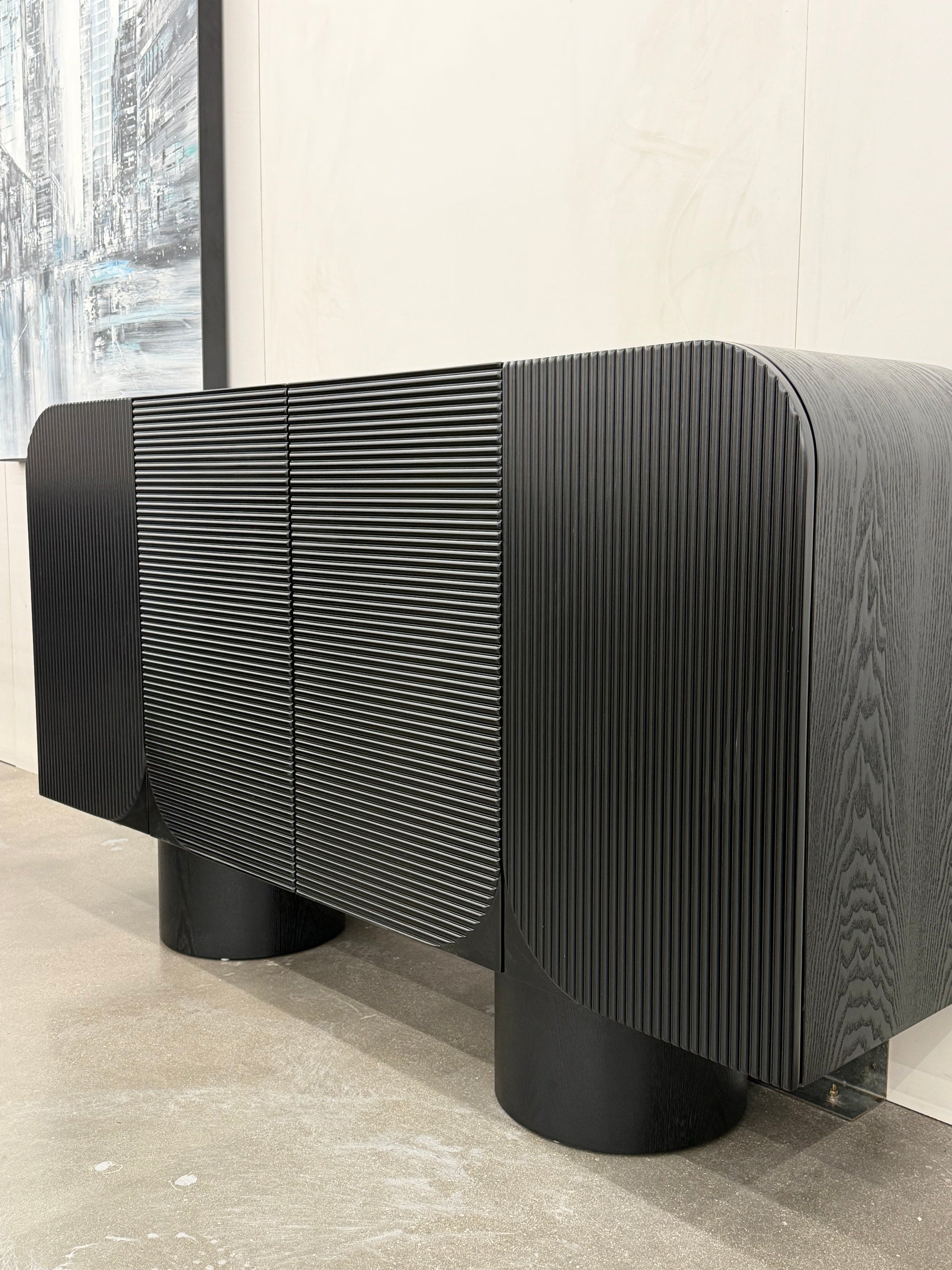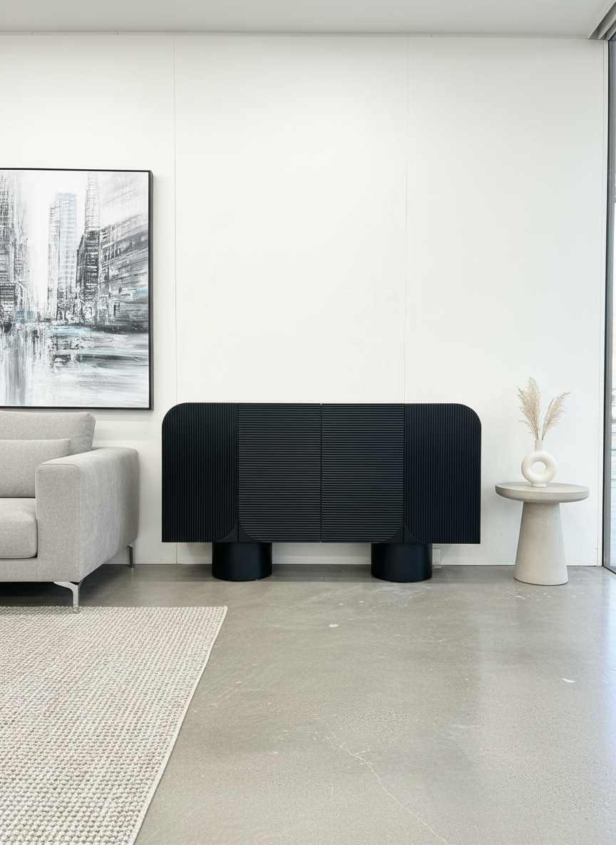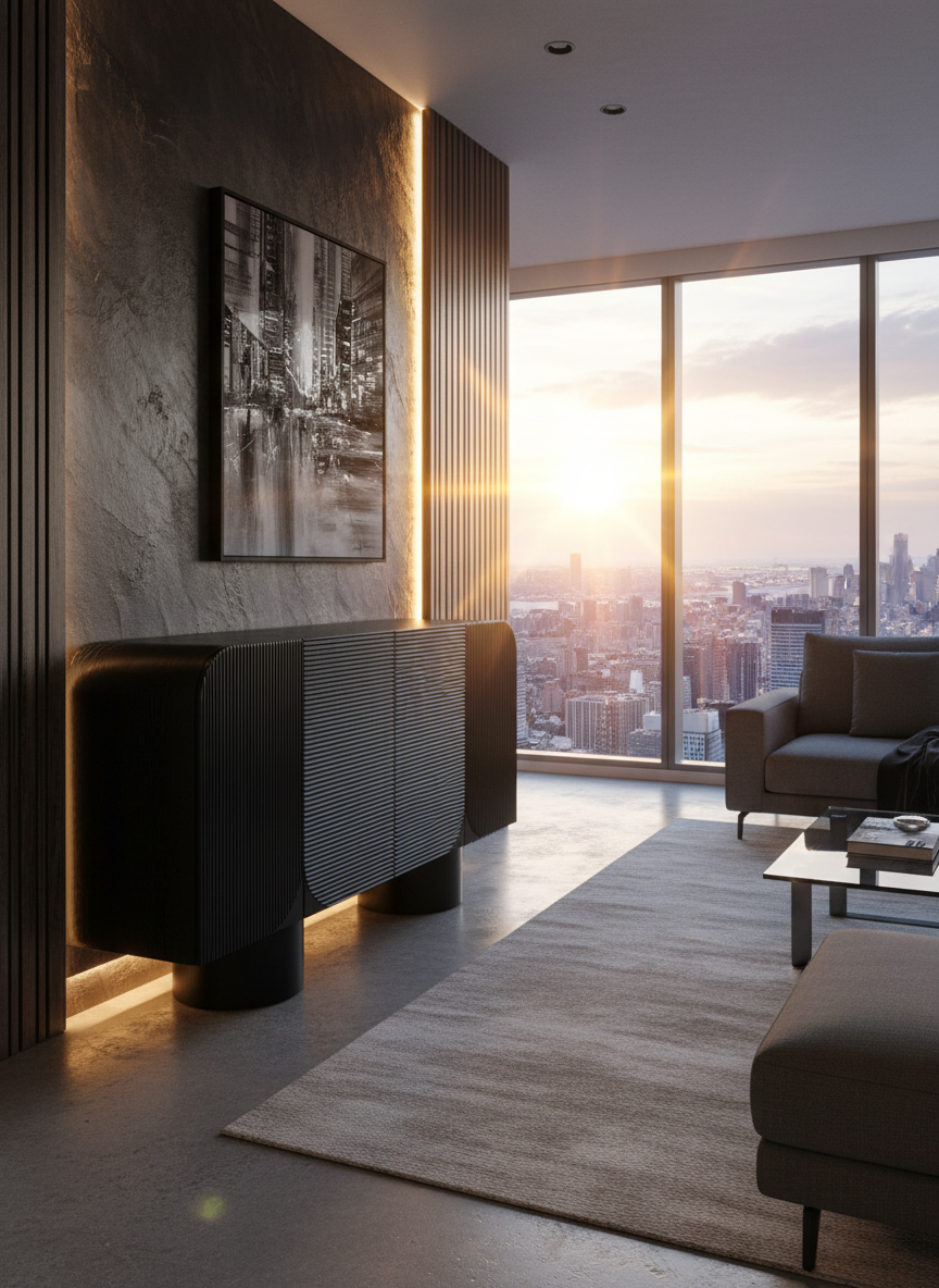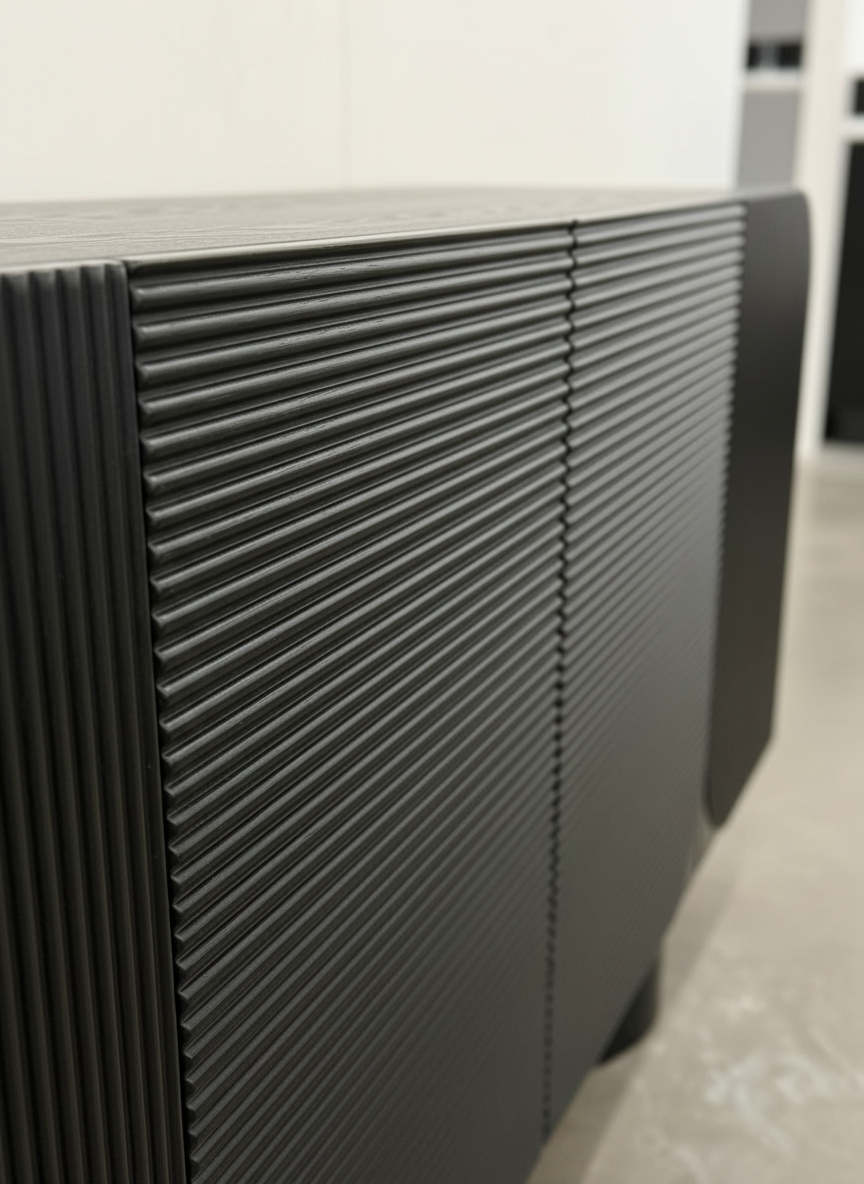 Where precision meets poetry. The Linear Echo Sideboard transforms geometric simplicity into a statement of refined elegance, featuring rhythmic linear grooves that create a mesmerizing play of light and shadow across its sculptural façade.
