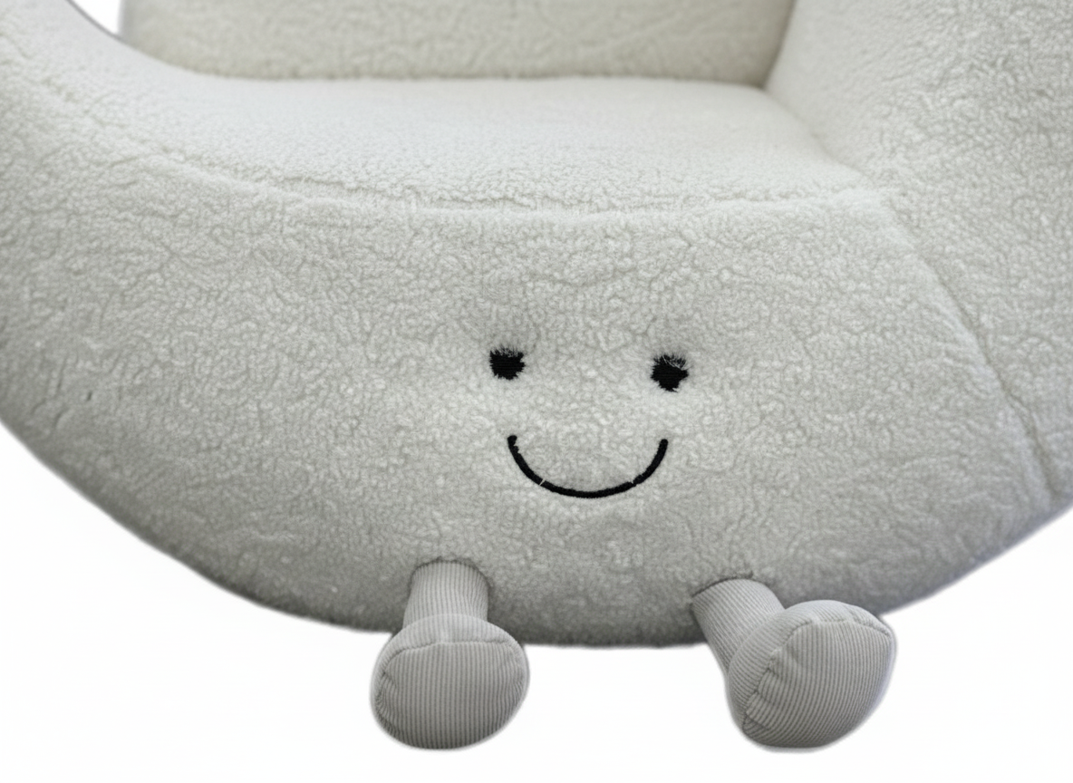 The Luna Chair brings playful elegance and delightful design into your living space. Shaped like a crescent moon with a friendly smile, this chair is perfect for adding a touch of whimsy and coziness to any room, whether for a child’s bedroom, a playroom, or a quirky accent piece.