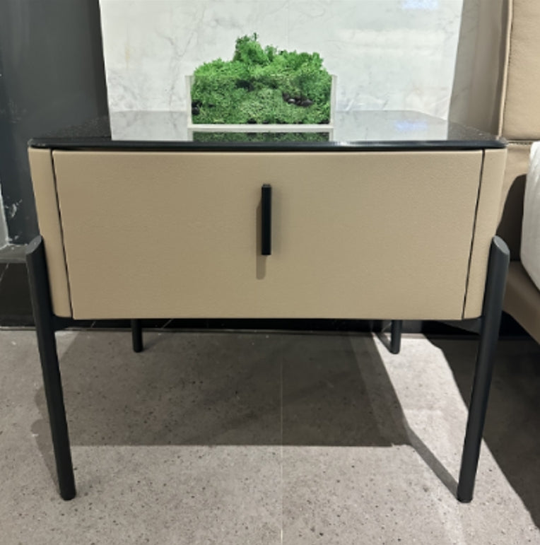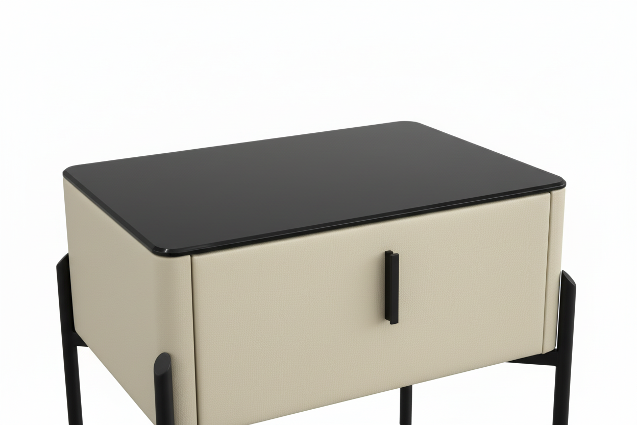 The black tempered glass surface adds a touch of sophistication while offering a durable and easy-to-clean space for lamps, books, or décor. -