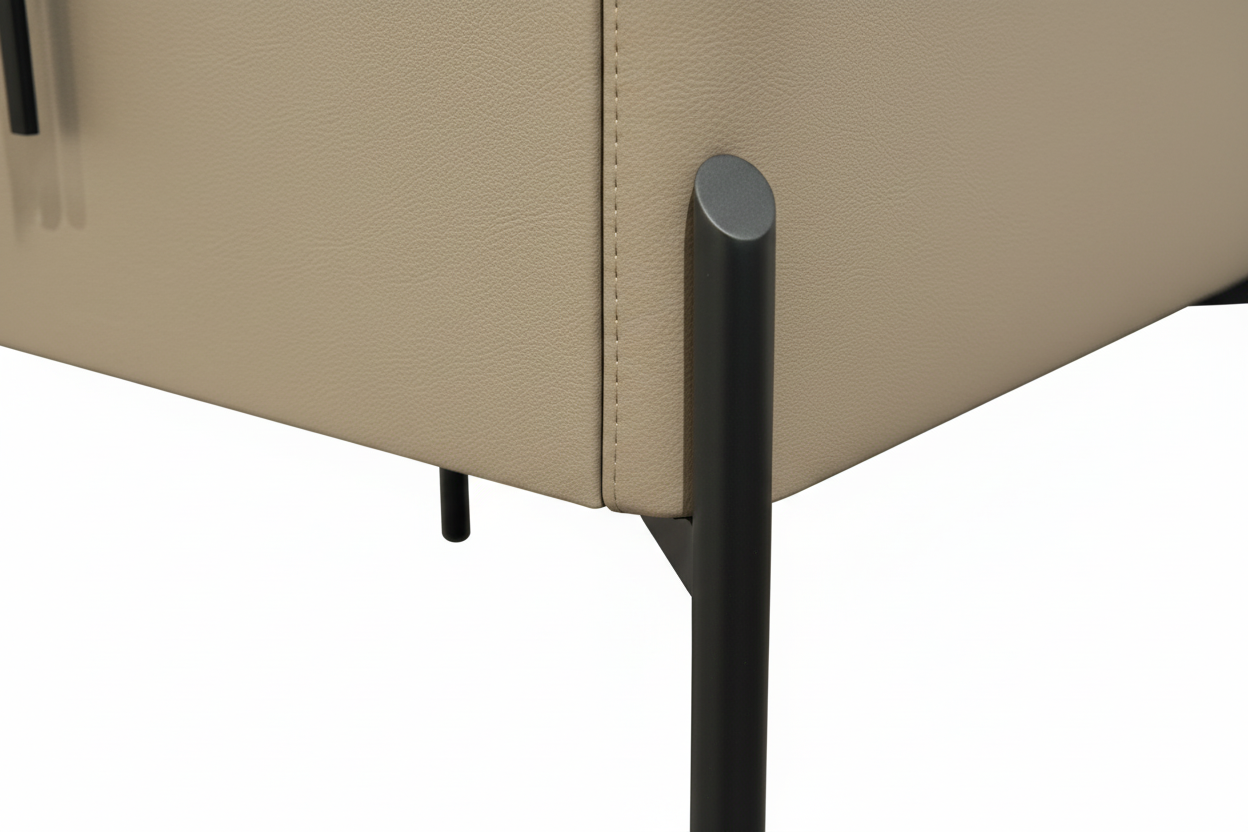Supported by slim, black powder-coated metal legs, ensuring stability and a lightweight, airy aesthetic. -