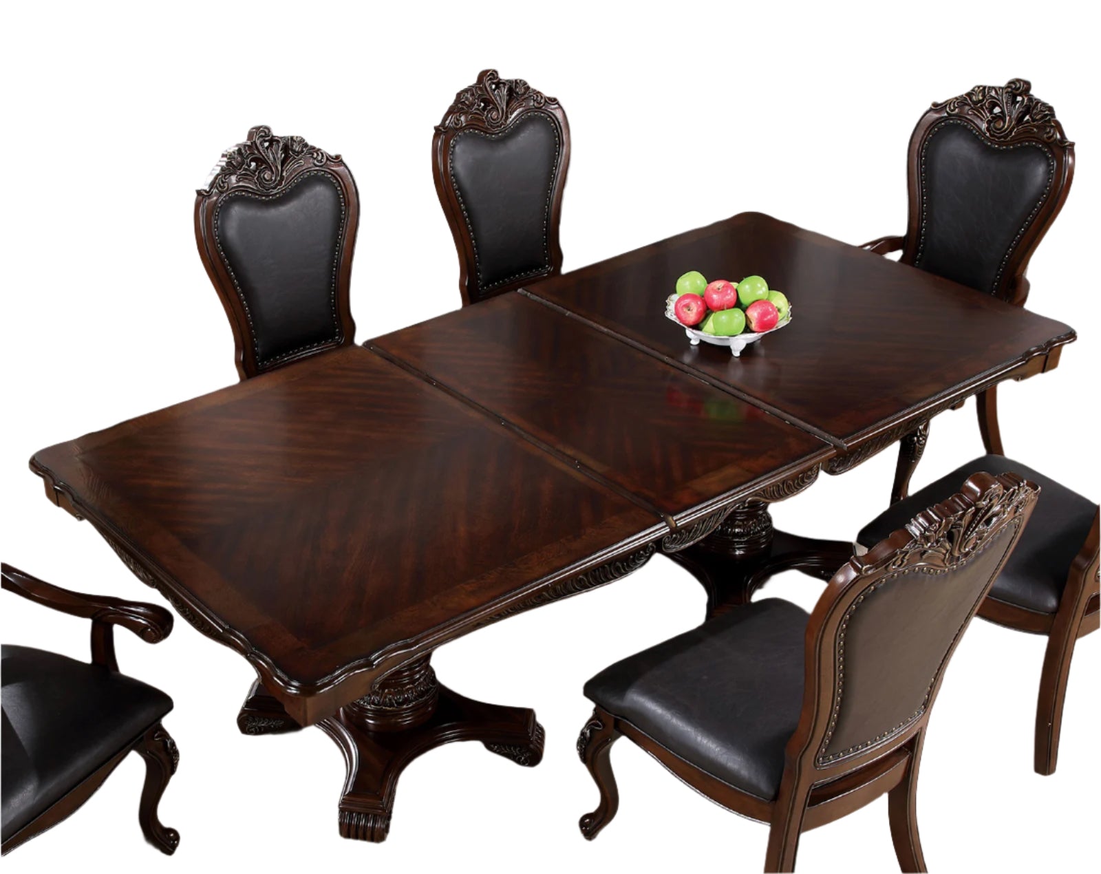 Elevate your dining space with the timeless beauty of the Manzanita Traditional Dining Table. Designed with rich, ornate detailing and a grand silhouette, this table brings a sense of luxury and sophistication to any formal dining room. Featuring a robust double pedestal base, hand-carved accents, and a spacious top with an expandable leaf, it’s a stunning centerpiece that combines visual drama with everyday functionality.