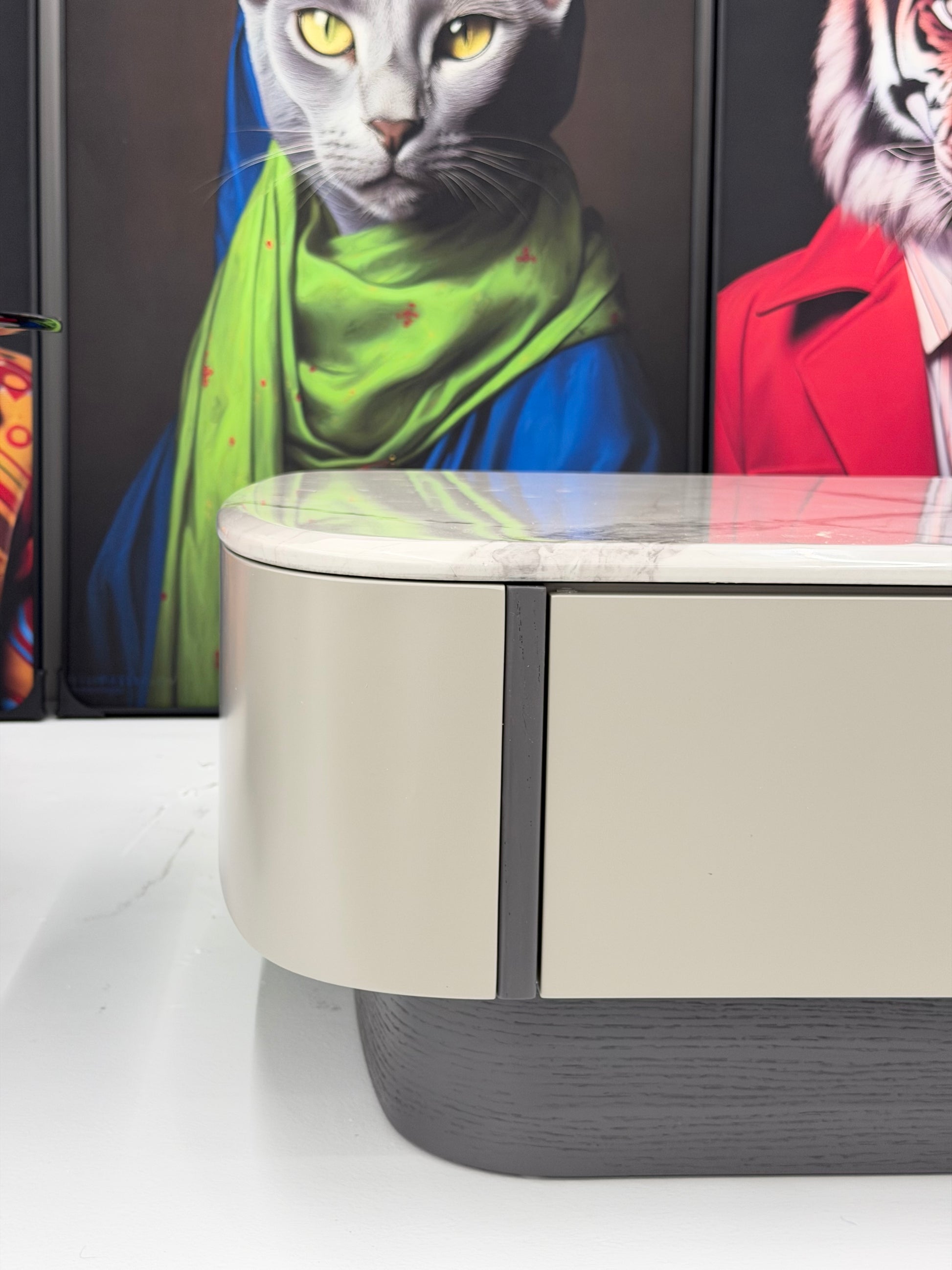 The Marble Aura Coffee Table blends soft curves with luxurious stone craftsmanship, creating a modern statement piece for refined living spaces. Designed with a gently rounded triangular silhouette, this table brings an elevated softness to any room while showcasing the natural elegance of marble. Its smooth lacquered base and contrasting stone top add depth, harmony, and contemporary sophistication.