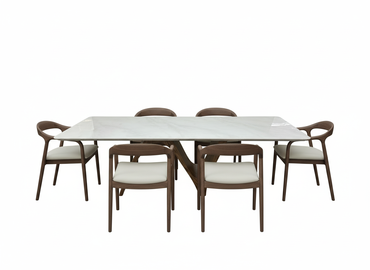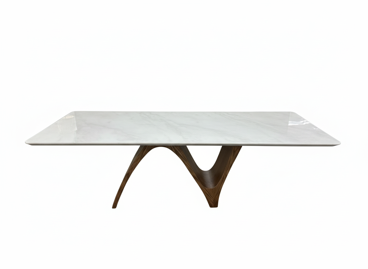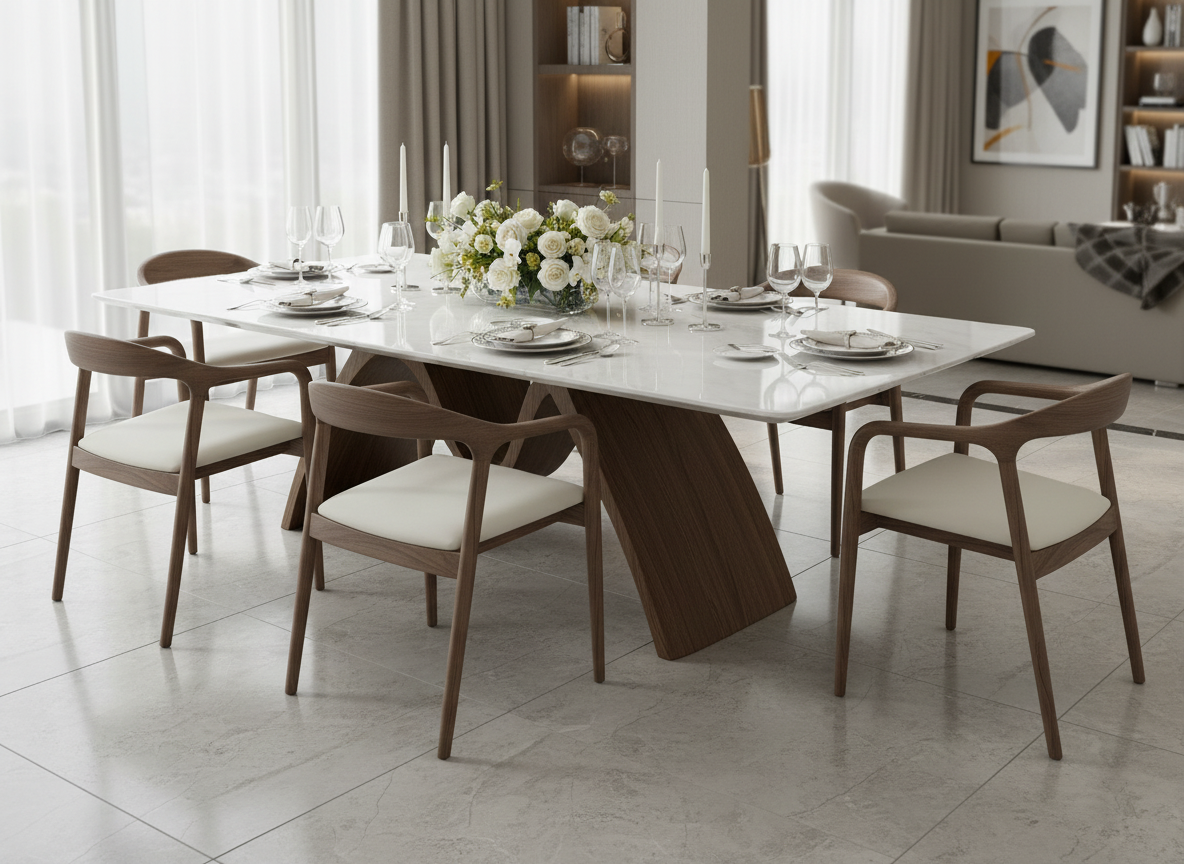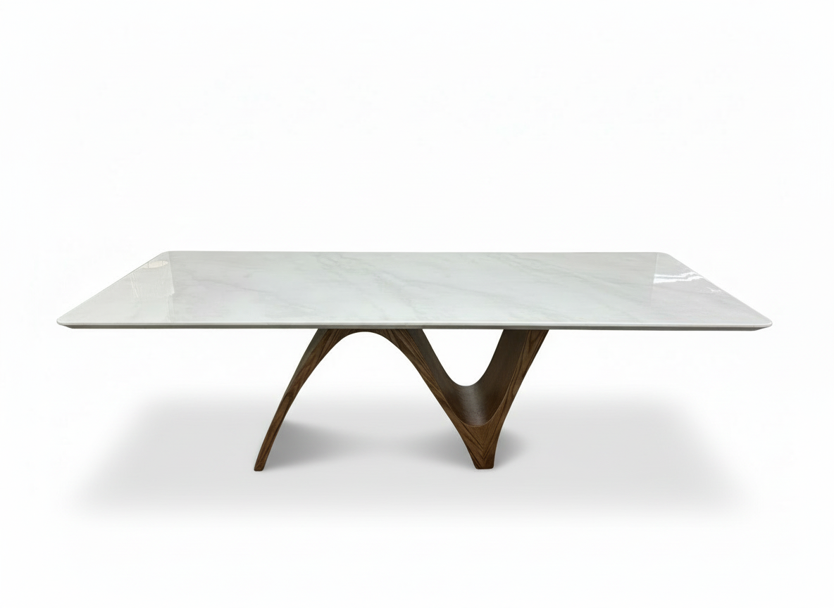 Maxridge Marble Dining Table – 8-Seater Rectangular Table with Sculptural Walnut Wood Base