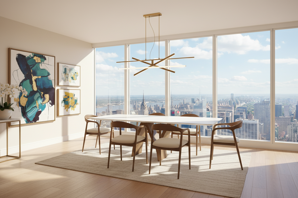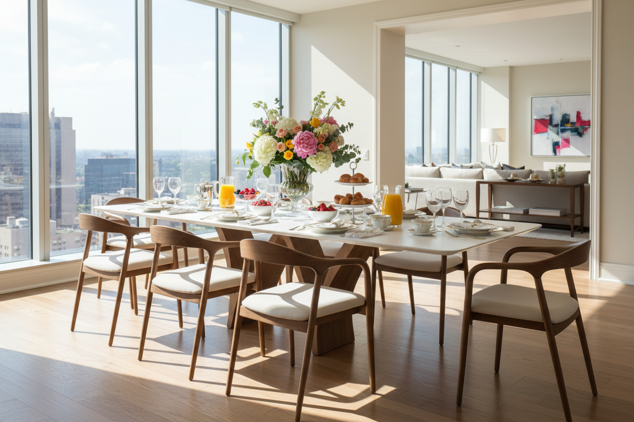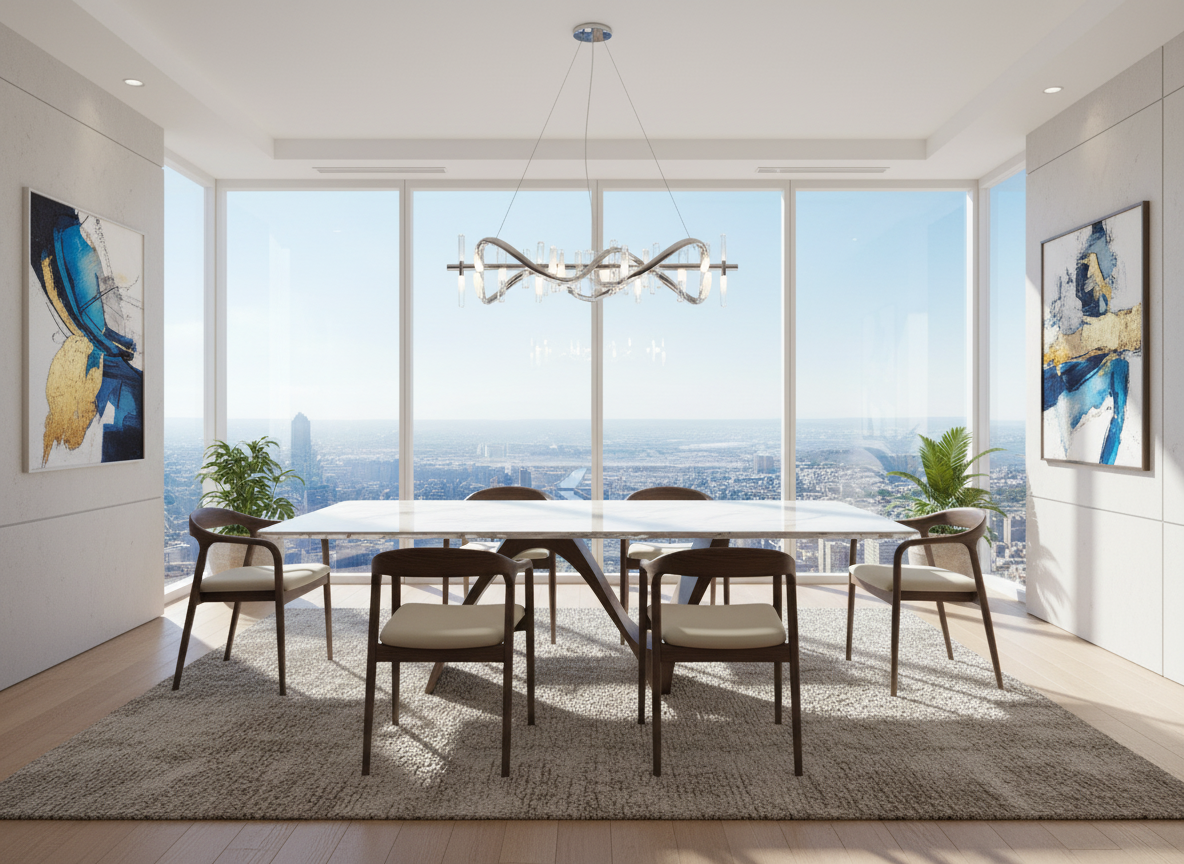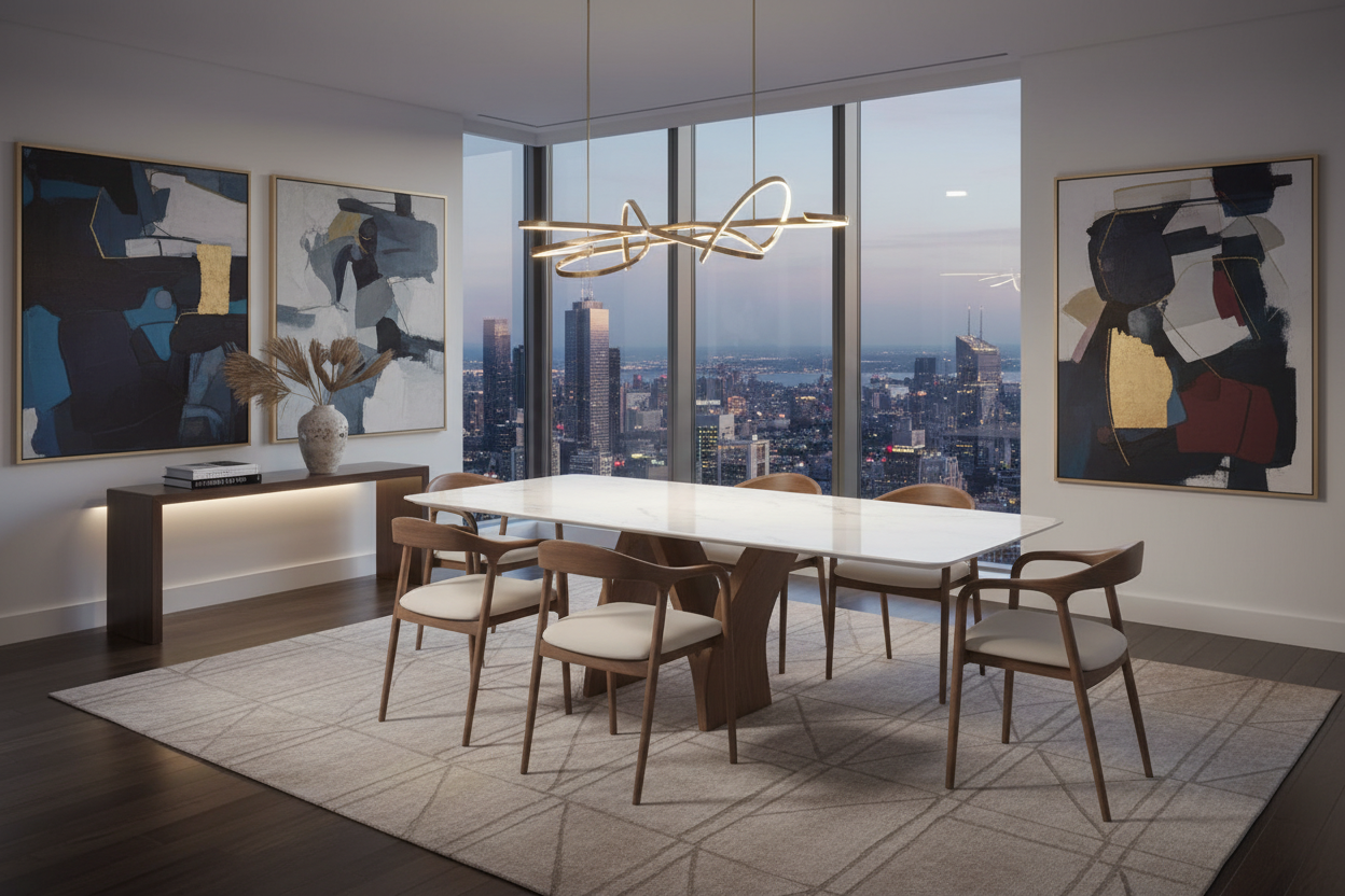 Modern homes, luxury dining rooms, or hospitality spaces seeking a statement marble dining table with seating for eight.