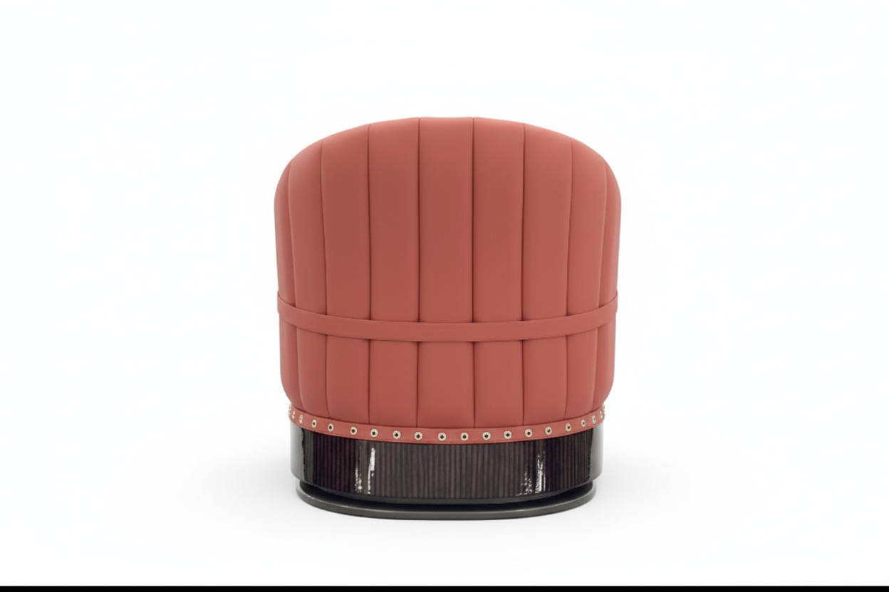 The Spheria Luxe isn't just seating – it's a conversation piece. The vertical channel tufting draws the eye upward, creating an elongating effect, while the curved black ribbed base adds architectural drama. The warm rose tone brings a touch of color without overwhelming your existing palette, making it versatile enough for modern, contemporary, or transitional interiors.