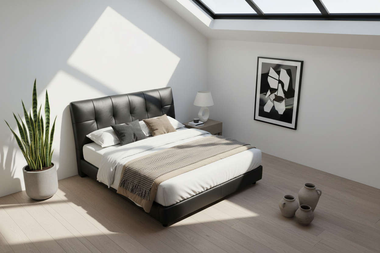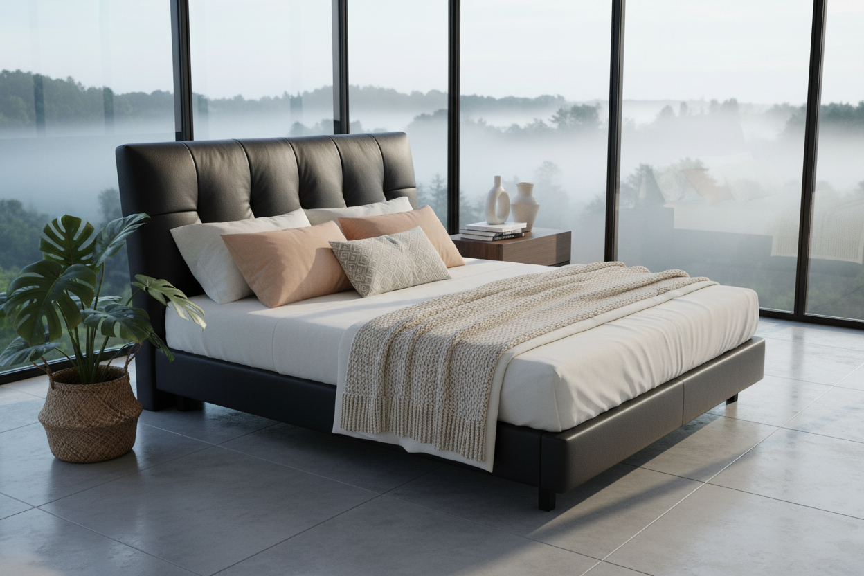 Upholstered in premium black leatherette, this bed adds a bold, modern touch while maintaining a neutral versatility.