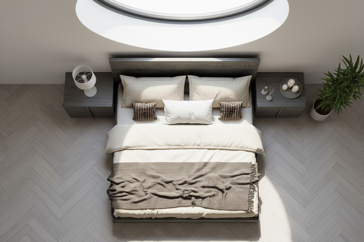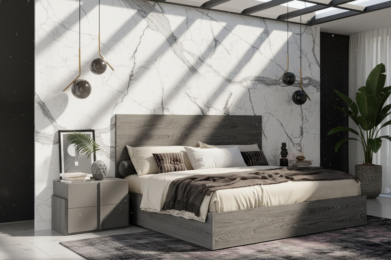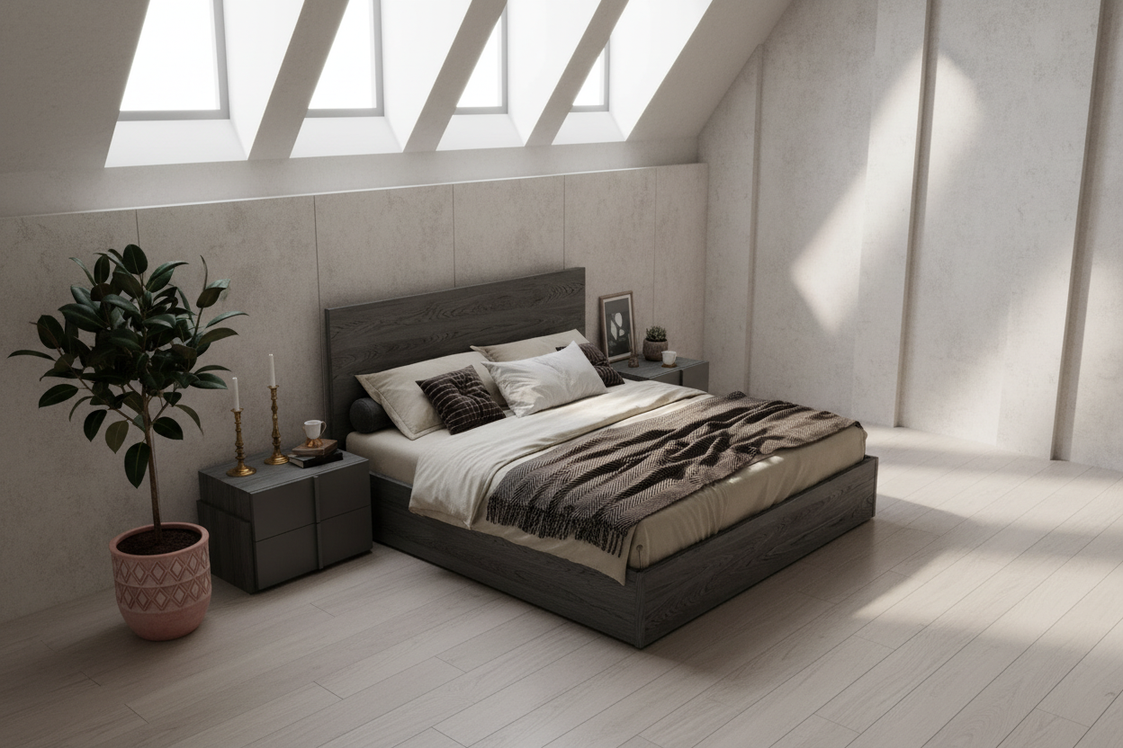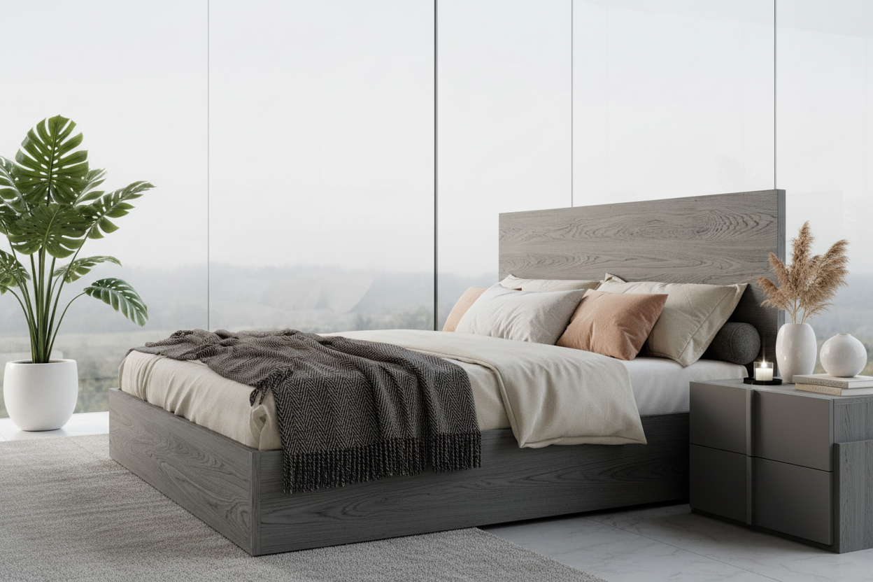 Space-Saving Frame: The bed’s streamlined design with clean lines keeps the space visually light and uncluttered.