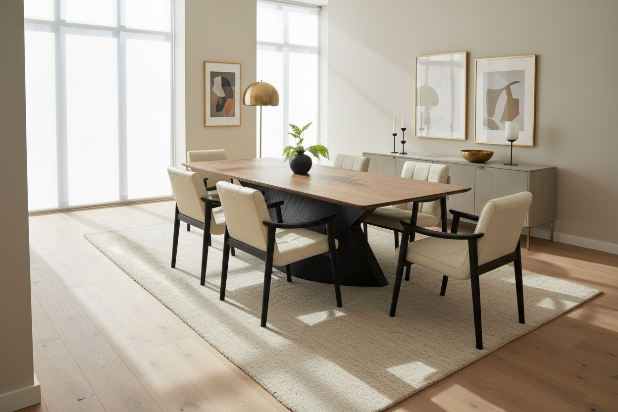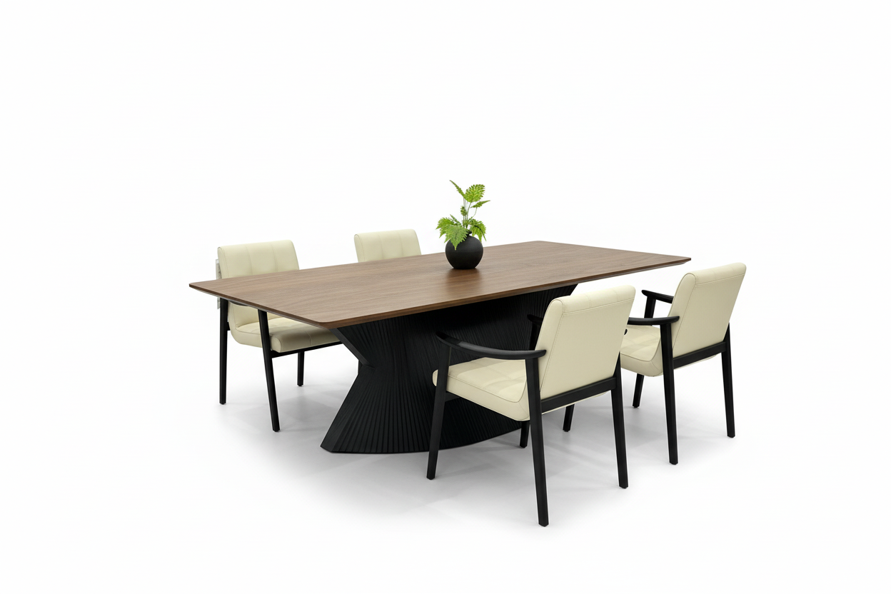 Discover elevated dining with the Noir Walnut Dining Table, a bold fusion of contemporary sophistication and natural elegance. Crafted from richly grained solid walnut wood, this table showcases a smooth, rectangular surface that highlights the warmth and character of natural wood. Its distinct matte black sculptural pedestal base adds architectural interest, balancing organic texture with a modern edge.
