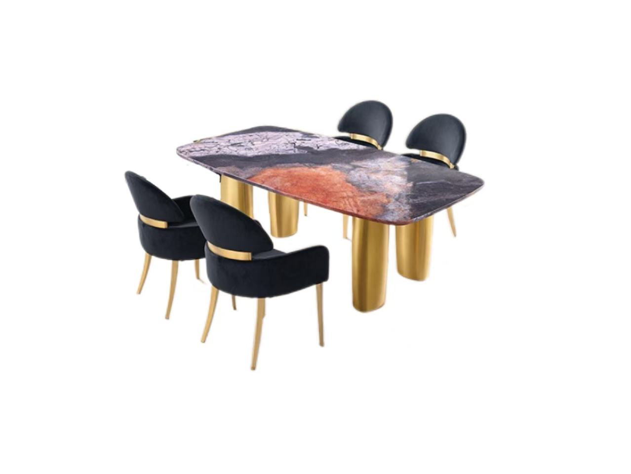 Bring modern elegance to your dining space with the Northolt 5PC Dining Table Set, an eye-catching combination of sleek lines and premium materials. The table’s sintered stone top delivers durability and a smooth, polished surface, while its sculptural stainless steel base in a matte gold finish creates a refined focal point for any room.